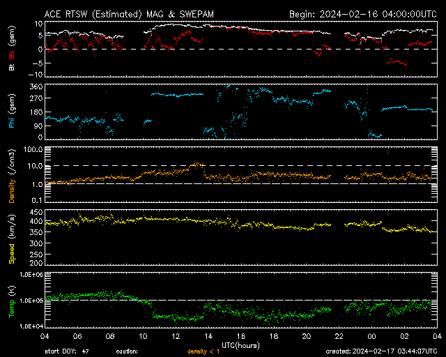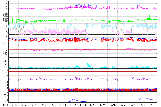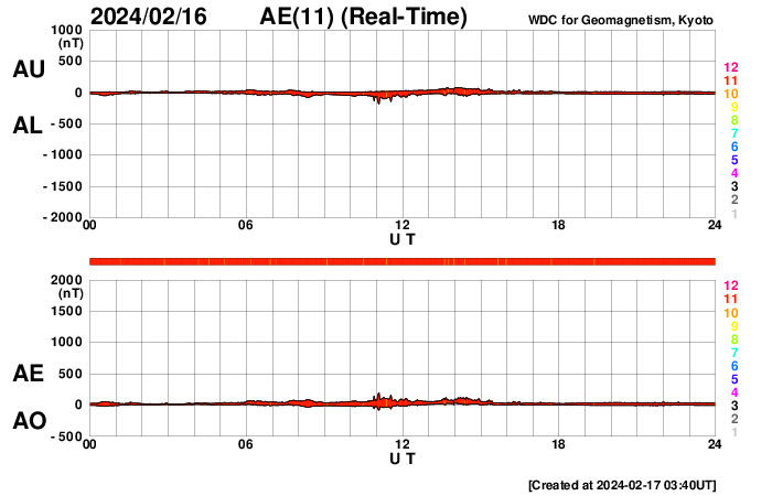 (c) GOES衛星SUVI 131 (NOAA)、(動画加工 : 宇宙天気ニュース) ![]() X2.5フレアに伴って、プロミネンス噴出が発生しています。 (c) GOES衛星SUVI 304 (NOAA)、(動画加工 : 宇宙天気ニュース) ![]() 太陽の右下へ広がるCME。 (c) STEREO Ahead衛星COR2 (NASA)、(動画加工 : 宇宙天気ニュース) ![]() 17日9時22分に種子島宇宙センターから打ち上げられたH3ロケット。 (c) 篠原学 ![]() SDO衛星のAIA193カメラによる太陽コロナの様子 (c) SDO (NASA) ![]() SDO衛星による太陽の可視光写真。マウスの矢印を写真に重ねると、黒点番号付きの写真に切り替わります。 (c) SDO (NASA) ![]() GOES衛星の太陽X線強度。赤・橙 = 0.1〜0.8 nm、青・紫 = 0.05〜0.4 nm (c) データ:NOAA/SWPC、作図:宇宙天気ニュース ![]() ACEが観測した太陽風の磁場(1番上の枠、白線は全体の強度、赤線は南北成分) および、太陽風の密度(3番目の橙線)、速度(4番目の黄線) (c) NOAA/SWPC ![]() AE指数(速報値) 下段のAEグラフの値が高くなると、オーロラ活動が活発化しています。 (c) 京都大学WDC ![]() ![]() 27日の太陽周期に合わせた図 太陽が同じ面を地球に向けていた27日前の変化から、今後を予想することができます。 (c) 作図:宇宙天気ニュース