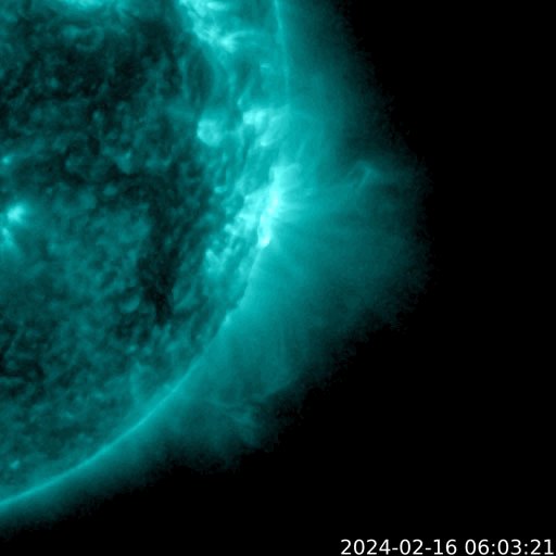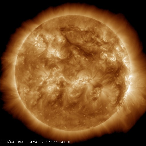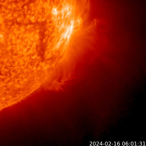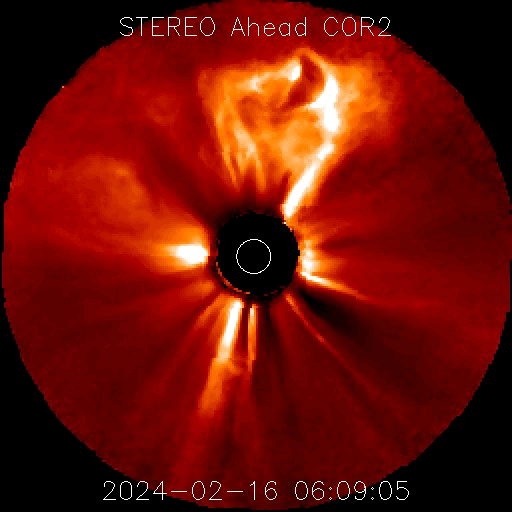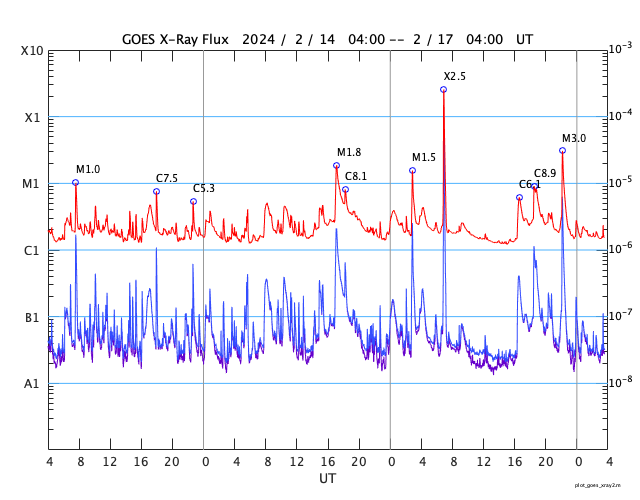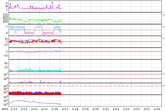 2024/ 2/17 12:45 更新 X2.5の大規模フレアが発生しました。 担当 篠原 昨日の午後、16日15時半(世界時15日6時半)に、 太陽の南西の端(右下)の3576黒点群で、 X2.5の大規模フレアが発生しました。 3576群では、2月9日のX3.3に続く、 2回目の大規模フレアです。 X線グラフは、短い時間の強まりになっています。 GOES衛星SUVI 131の動画も、 輝いた後にすぐに暗くなっていますが、 SUVI 304を見ると、 フレアに続いてプロミネンスが大きく噴出しています。 STEREO Ahead衛星COR2では、 太陽の右下に向かって CME(コロナ質量放出)が広がっています。 地球に対しては横向きの噴出なので、 影響はないか、到来しても小さい変化になりそうです。 3576群は、今朝、17日7時(世界時16日22時)に M3.0の中規模フレアを起こしましたが、 現在は西の端に沈んで、黒点は見えなくなっています。 太陽風は、400km/秒と平均的な速さでしたが、 グラフの最後は、350km/秒と低速になっています。 磁場強度は、5〜8nTの間を上下していますが、 全体としては平均的な状態です。 磁場の南北成分は、北寄りの傾向が続いています。 磁気圏は穏やかで、 AE指数はほとんど変化のない状態です。 今朝、17日9時22分に種子島宇宙センターから H3ロケット2号機が打ち上げられました。 今日は天気が良く、学校から見ることができたので、 写真を紹介します。 低空に薄雲がかかって、見にくくなっていますが、 ロケットの煙が左上へ伸びています。 目ではオレンジ色の炎も見ることができました。