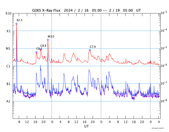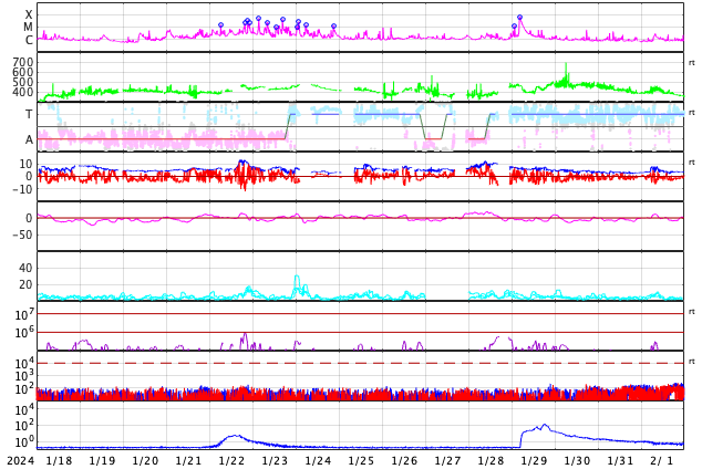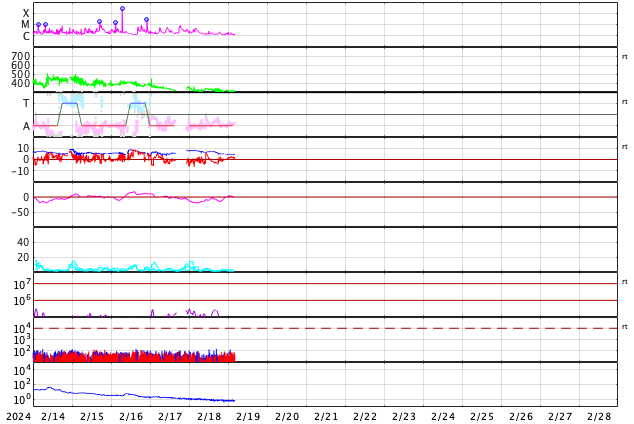 GOES衛星の太陽X線強度。赤・橙 = 0.1〜0.8 nm、青・紫 = 0.05〜0.4 nm (c) データ:NOAA/SWPC、作図:宇宙天気ニュース ![]() | |||||||||||||||||||||||||||||||||||||||||||||||||||||||||||||||||||||||||||||||||||||||||||||||||||||||||||||||||||||||||||||||||||||||||||||||||||||||||||||||||||||||||||||||||||||||||||||||||||||||||||||||||||||||||||||||||||||||||||||||||||||||||
