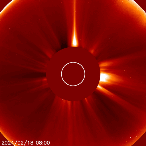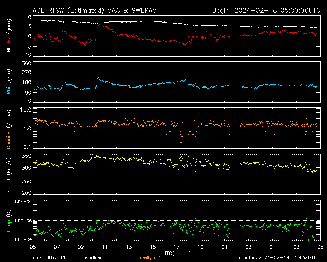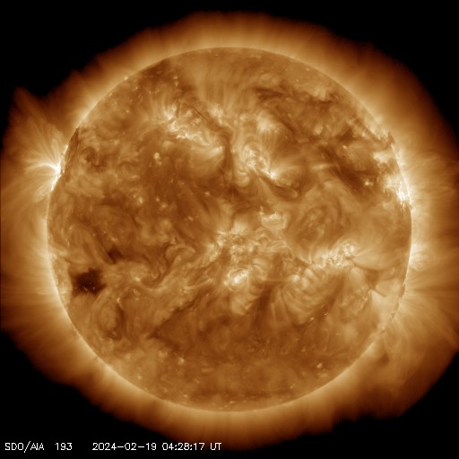 2024/ 2/19 13:43 更新 太陽風は低速で磁気圏も静穏です。 担当 篠原 太陽風は、310km/秒と低速の風が続いています。 磁場強度は7nTから4nTへ少し下がっています。 こちらは平均的な状態です。 磁場の南北成分は、 南向きがしばらく続いていますが、 速度が下がっているため、磁気圏への影響は小さく、 AE指数は小さい変化が発生している程度です。 SDO衛星AIA193では、 南東の端(左下)にコロナホールが見え始めています。 どのくらいの広がりがあるでしょうか。 太陽は、こちら側では目立った活動は発生していません。 北東の端(左上)に現れた3590黒点群で、 小さいフレアが発生しています。 どの程度の活動度の領域でしょうか。 昨夜、18日19時(世界時18日10時)に、 太陽の左下に向かって飛び出す CME(コロナ質量放出)が発生しています。 太陽の向こう側で発生した現象で、 地球への影響はありません。 これと似た、太陽の向こう側の南寄りの噴出を、 13日、15日、16日、18日と連日のように紹介しています。 関係する現象かどうかは分かりませんが、 この後も活動は続くでしょうか。 ![]() 太陽の南東側へ飛び出すCME。向こう側の現象です。 (c) SOHO衛星LASCO C2、C3 (ESA & NASA)、(動画加工 : 宇宙天気ニュース) ![]() SDO衛星のAIA193カメラによる太陽コロナの様子 (c) SDO (NASA) ![]() SDO衛星による太陽の可視光写真。マウスの矢印を写真に重ねると、黒点番号付きの写真に切り替わります。 (c) SDO (NASA) ![]() ACEが観測した太陽風の磁場(1番上の枠、白線は全体の強度、赤線は南北成分) および、太陽風の密度(3番目の橙線)、速度(4番目の黄線) (c) NOAA/SWPC ![]() AE指数(速報値) 下段のAEグラフの値が高くなると、オーロラ活動が活発化しています。 (c) 京都大学WDC ![]() ![]() 27日の太陽周期に合わせた図 太陽が同じ面を地球に向けていた27日前の変化から、今後を予想することができます。 (c) 作図:宇宙天気ニュース