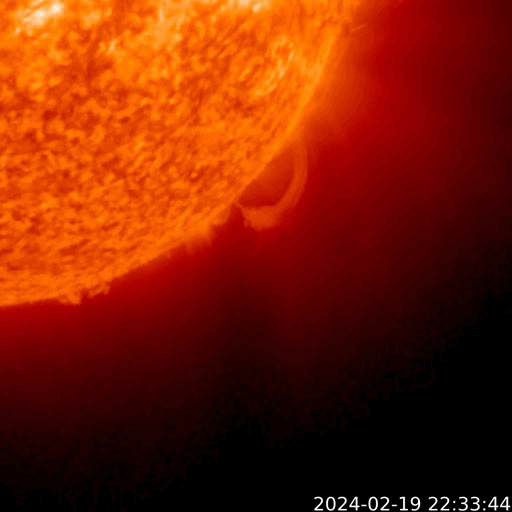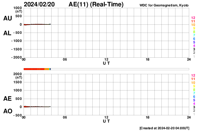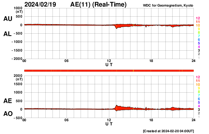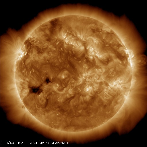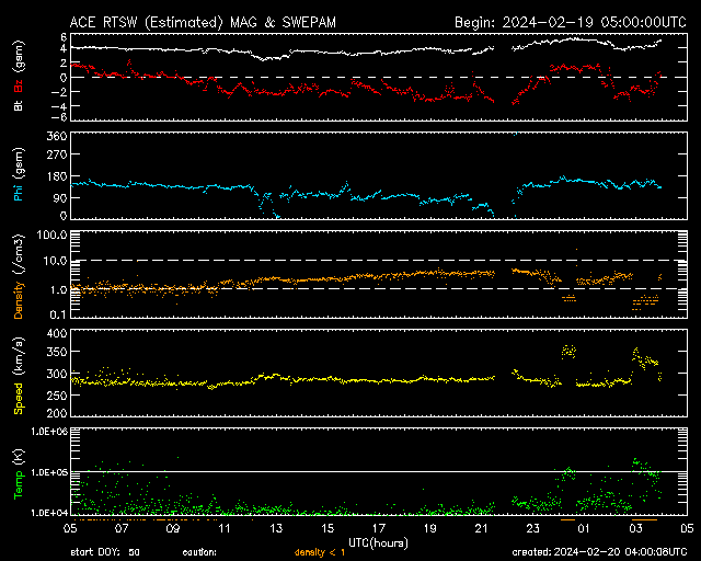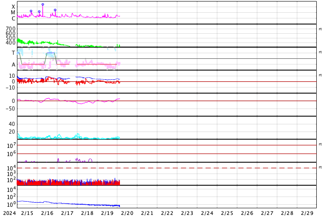 2024/ 2/20 13:01 更新 太陽風はかなり低速になり、磁気圏も穏やかです。 担当 篠原 太陽風の速度は300km/秒台を割り、 280km/秒に下がりました。 グラフの最後で330km/秒に少し上がっていますが、 低速の状態は続いています。 太陽風の磁場強度は、4nTと平均的な状態です。 磁場の南北成分は弱い南寄りになっていますが、 速度が下がっているので、磁気圏への影響は小さく、 AE指数は小さい変化がしばらく続いているだけです。 SDO衛星AIA193の太陽コロナ写真では、 南東(左下)のコロナホールが見える様になっていますが、 広がりは前周期よりも小さくなっている様です。 太陽は、北東の端(左上)の3590黒点群で、 C6.7、C5.7などの小規模フレアが発生しています。 この後の活動に注目してください。 また、今朝、20日8時(世界時19日23時)に、 太陽の南西の端の向こう側で プロミネンス噴出が発生しました。 噴出の様子をGOES衛星SUVI 304の動画で紹介します。