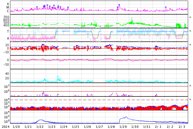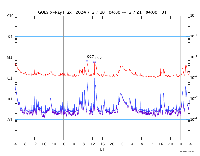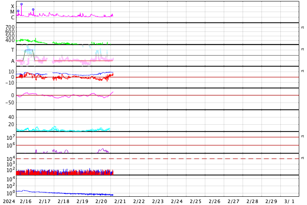 GOES衛星の太陽X線強度。赤・橙 = 0.1〜0.8 nm、青・紫 = 0.05〜0.4 nm (c) データ:NOAA/SWPC、作図:宇宙天気ニュース ![]() | ||||||||||||||||||||||||||||||||||||||||||||||||||||||||||||||||||||||||||||||||||||||||||||||||||||||||||||||||||||||||||||||||||||||||||||||||||||||||||||||||||||||||||||||||||||||||||||||||||||||||||||||||||||||||||||||||||||||||||||||||
