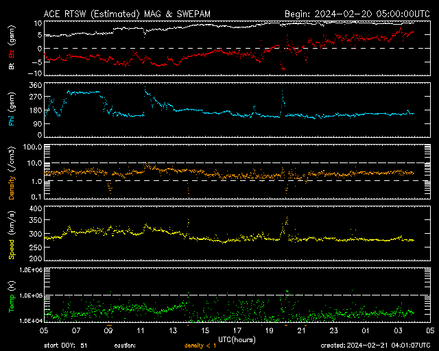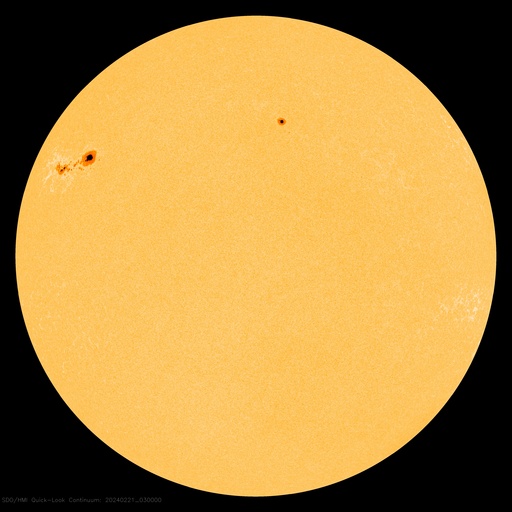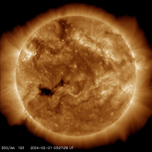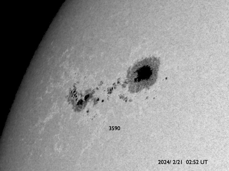 2024/ 2/21 13:02 更新 太陽風はかなり低速です。3590黒点群が目立っています。 担当 篠原 太陽風の速度は、 昨日のニュースの後、すぐに300km/秒へ戻り、 今日に入った頃からは280km/秒とかなり低速になっています。 磁場強度は、5nTから9nTへゆっくり上がり、 やや強くなっています。 磁場の南北成分は、 グラフの前半は -5nT近い南向きが続きが続きました。 速度は下がっていますが、 磁気圏の活動はある程度強まって、 AE指数は500nTと中規模の変化がしばらく続いています。 その後、磁場は北向きに切り替わっています。 このため、現在の磁気圏は穏やかで、 AE指数は変化がなくなっています。 SDO衛星AIA193では、 中心部の南東側(左下)に小ぶりのコロナホールが見えています。 5日後くらいに弱い影響がやって来るかもしれません。 太陽は、北東(左上)の3590黒点群の大きさが目立っています。 SDO衛星による拡大写真を掲載します。 活動としては落ち着いた状態で、 昨日のニュース以降は、 C2の小さい小規模フレアを起こした程度です。
