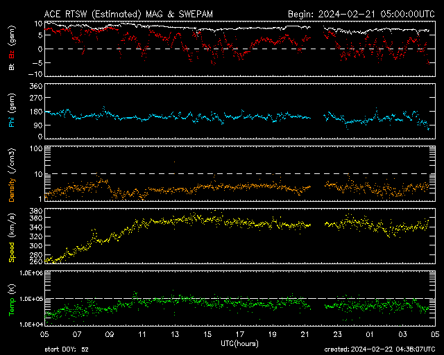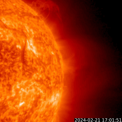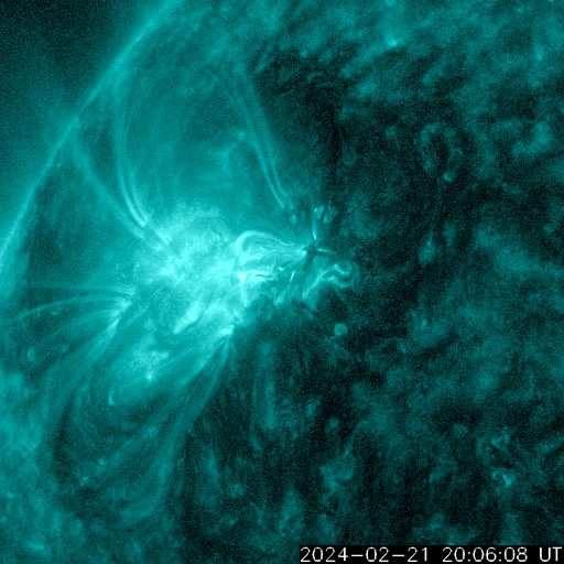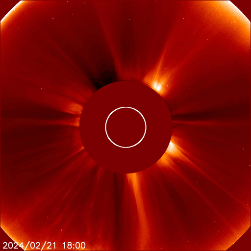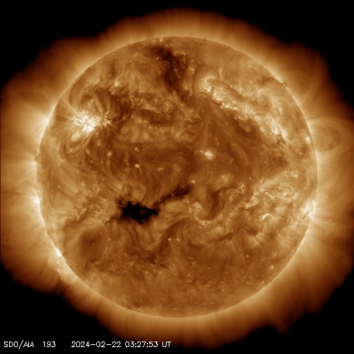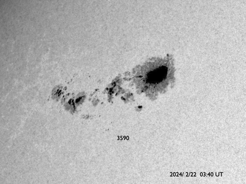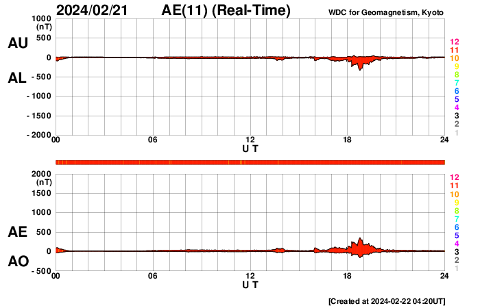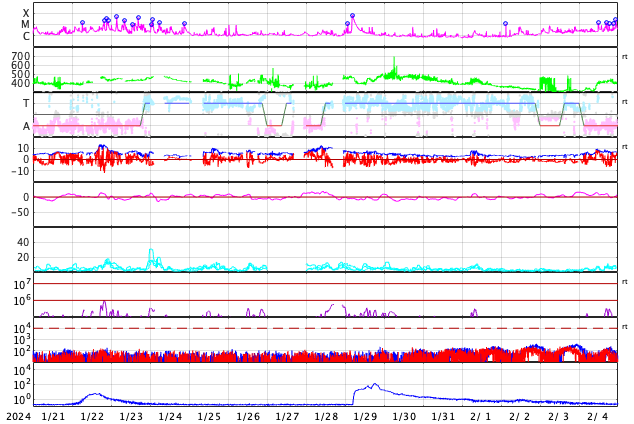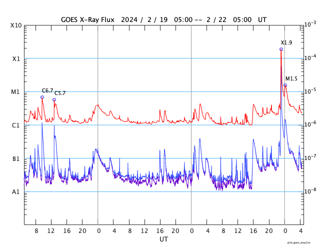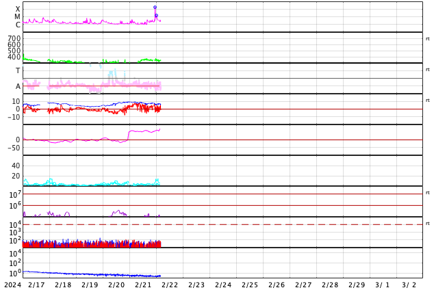 2024/ 2/22 13:39 更新 X1.8の大規模フレアが発生しました。太陽風は低速の状態です。 担当 篠原 今朝、22日8時(世界時21日23時)に、 太陽の北東側(左上)の3590黒点群で、 X1.8の大規模フレアが発生しました。 SDO衛星AIA131の動画を掲載します。 3590群は、昨日のニュース以降も C1〜4の小規模フレアを起こす程度だったのですが、 いきなり規模の大きいフレアが発生しました。 黒点は現在も大きい状態です。 引き続き活動に注目して下さい。 太陽では、今日未明、 22日2時(世界時21日17時)頃に、 西側(右側)でフィラメント噴出が発生しています。 GOES衛星SUVI 304の動画を掲載します。 この噴出により、CME(コロナ質量放出)が 太陽の右側に広がっています。 横向きに近い噴出になっていて、 地球への影響はなさそうです。 そして、SDO衛星AIA131の画像を見ていると、 南東の端(左下)の向こう側に活動的な領域がある様で、 22日1時(世界時21日16時)にC4.1の小規模フレア、 22日9時(世界時22日0時)にM1.5の中規模フレア が発生しています。 この後、どの様な領域が現れるでしょうか。 注目してください。 太陽風は、昨日の午後から速度が少し上がり、 270km/秒から350km/秒へ変化しています。 低速の状態は続いています。 磁場強度は、9nTから7nTへゆっくり下がり、 平均的な状態です。 磁気圏は静穏で、 AE指数は300nTの小規模の変化が1回発生した程度です。 SDO衛星AIA193では、 南側のコロナホールが中心線に達しています。 3〜4日後くらいに太陽風の速度がやや高まるかもしれません。