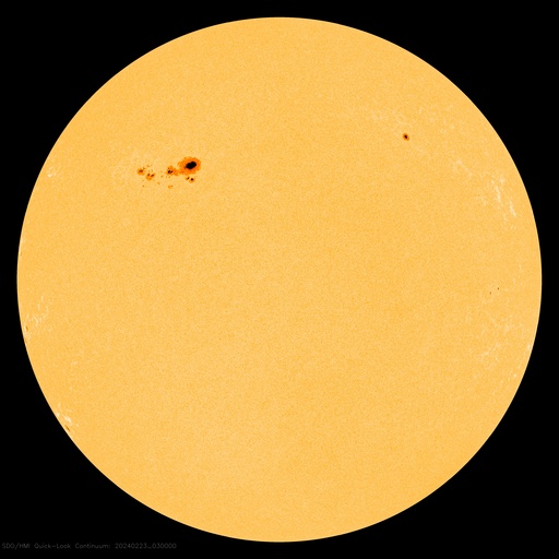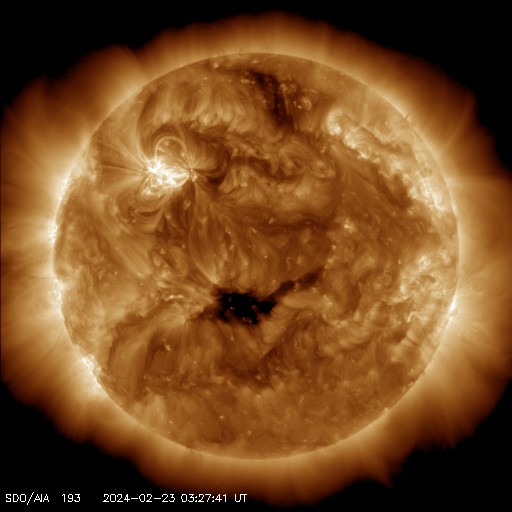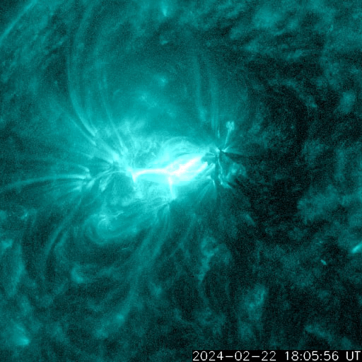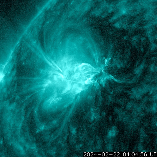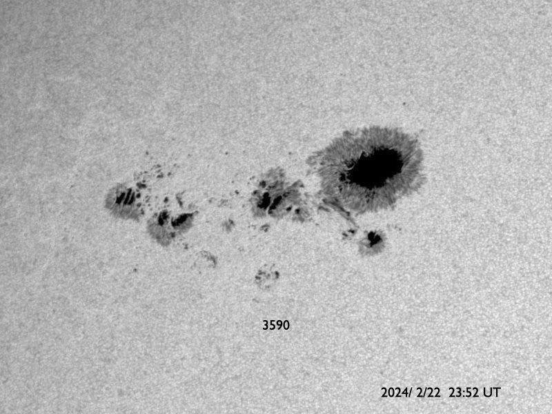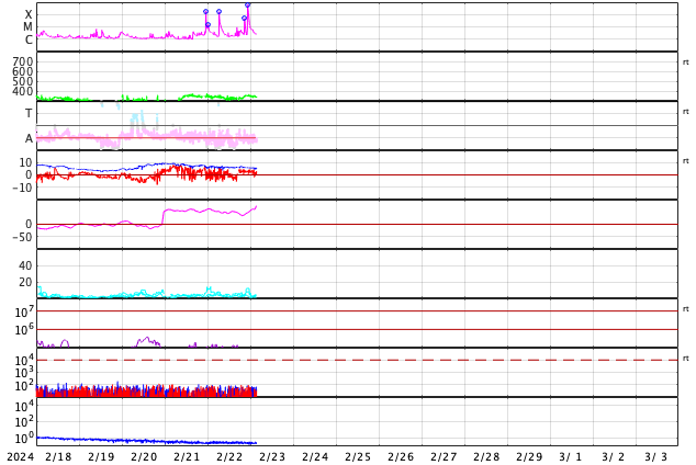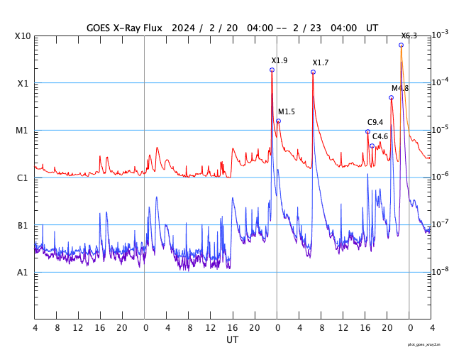 2024/ 2/23 12:55 更新 X6.3の大規模フレアが発生しました。 担当 篠原 昨日の朝にX1.8の大規模フレアを起こした3590黒点群で、 その後、Xフレアが2回発生しています。 昨日の午後、22日15時半(世界時22日6時半)にX1.7、 そして、今朝、23日7時(世界時22日22時)にX6.3です。 SDO衛星AIA131による動画をそれぞれ掲載します。 X6.3のフレアは、世界時12月31日に発生したX5.0を超えて、 現在の第25活動周期最大のフレアになっています。 一方、SOHO衛星のLASCO C2、C3を見ると、 はっきり分かるほどのCME(コロナ質量放出)は 発生していない様です。 このため、太陽風の乱れはやって来ないのではないでしょうか。 3590黒点群の拡大写真を掲載します。 かなり大きいフレアを起こしましたが、 この後の活動はどうなるでしょうか。 引き続き注目してください。 太陽風は、速度は320〜340km/秒と低速の状態が続いています。 磁場強度は、6nTと平均的な状態です。 磁場の南北成分は、 グラフの前半は南寄り、後半は北寄りになっています。 南寄りの頃に、AE指数で200〜300nTの 小規模の変化が発生していましたが、 その後は変化がなくなり、現在の磁気圏は穏やかです。 SDO衛星AIA193の太陽コロナ写真では、 南半球のコロナホールが、太陽の中央部に見えています。 この領域の影響で、 3日後くらいに太陽風の速度が高まるかもしれません。 どのくらいの変化がやって来るか、注目してください。 ![]() 3590黒点群で発生したX1.7の大規模フレア。 (c) SDO衛星AIA131 (NASA)、(動画加工 : 宇宙天気ニュース) ![]() 3590黒点群で発生したX6.3の大規模フレア。 (c) SDO衛星AIA131 (NASA)、(動画加工 : 宇宙天気ニュース) ![]() 3590黒点群の拡大写真。 (c) SDO衛星HMII (NASA)、作図 : 宇宙天気ニュース ![]() SDO衛星のAIA193カメラによる太陽コロナの様子 (c) SDO (NASA) ![]() SDO衛星による太陽の可視光写真。マウスの矢印を写真に重ねると、黒点番号付きの写真に切り替わります。 (c) SDO (NASA) ![]() GOES衛星の太陽X線強度。赤・橙 = 0.1〜0.8 nm、青・紫 = 0.05〜0.4 nm (c) データ:NOAA/SWPC、作図:宇宙天気ニュース ![]() ACEが観測した太陽風の磁場(1番上の枠、白線は全体の強度、赤線は南北成分) および、太陽風の密度(3番目の橙線)、速度(4番目の黄線) (c) NOAA/SWPC ![]() AE指数(速報値) 下段のAEグラフの値が高くなると、オーロラ活動が活発化しています。 (c) 京都大学WDC ![]() ![]() 27日の太陽周期に合わせた図 太陽が同じ面を地球に向けていた27日前の変化から、今後を予想することができます。 (c) 作図:宇宙天気ニュース