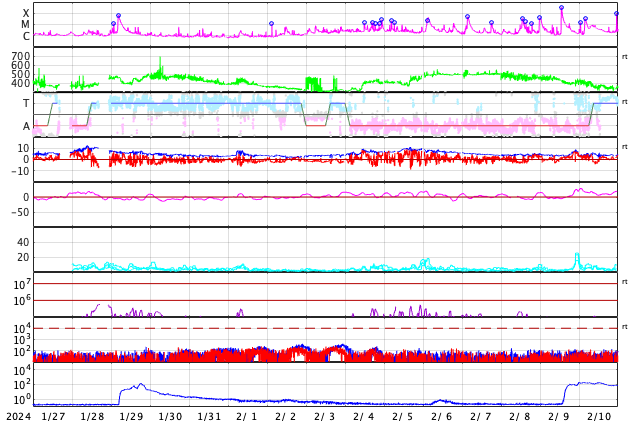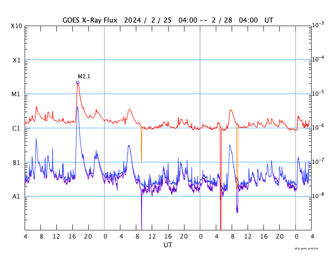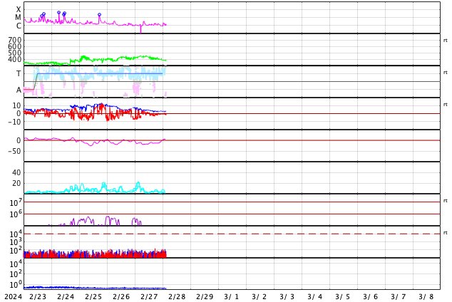 GOES衛星の太陽X線強度。赤・橙 = 0.1〜0.8 nm、青・紫 = 0.05〜0.4 nm (c) データ:NOAA/SWPC、作図:宇宙天気ニュース ![]() | |||||||||||||||||||||||||||||||||||||||||||||||||||||||||||||||||||||||||||||||||||||||||||||||||||||||||||||||||||||||||||||||||||||||||||||||||||||||||||||||||||||||||||||||||||||||||||||||||||||||||||||||||||||||||||||||||