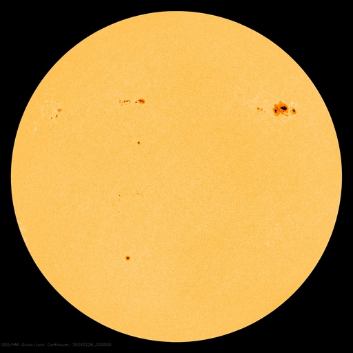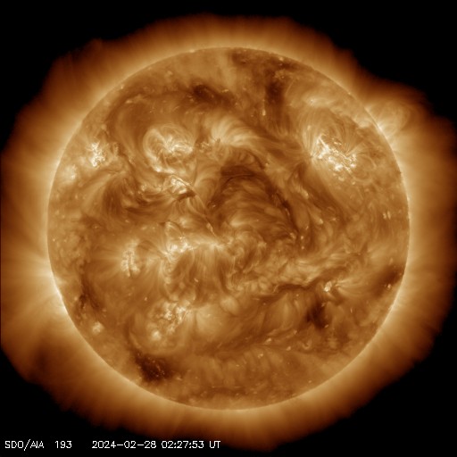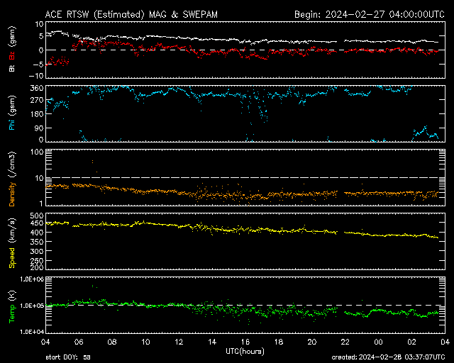 2024/ 2/28 12:31 更新 太陽風はやや低速になっています。太陽は穏やかです。 担当 篠原 太陽風は、速度が430km/秒から380km/秒へ下がり、 やや低速になっています。 磁場強度も3nTとやや弱くなっています。 磁場の南北成分は、0nT付近で小さく変化しています。 磁気圏は基本的に静穏で、 AE指数は、磁場が一時的に南向きに振れた頃に 500nTの中規模の変化が発生していますが、 その後は変化のない状態です。 SDO衛星AIA193の太陽コロナ写真では、 コロナホールが特に見えていません。 太陽風は、穏やかな状態が続きそうです。 太陽は、穏やかな状態が続いていて、 北西(右上)に進んだ3590黒点群でC3.4、 中心部北東側(左上)の3594群でC2.2 の小規模フレアが発生した程度です。 ![]() SDO衛星のAIA193カメラによる太陽コロナの様子 (c) SDO (NASA) ![]() SDO衛星による太陽の可視光写真。マウスの矢印を写真に重ねると、黒点番号付きの写真に切り替わります。 (c) SDO (NASA) ![]() ACEが観測した太陽風の磁場(1番上の枠、白線は全体の強度、赤線は南北成分) および、太陽風の密度(3番目の橙線)、速度(4番目の黄線) (c) NOAA/SWPC ![]() AE指数(速報値) 下段のAEグラフの値が高くなると、オーロラ活動が活発化しています。 (c) 京都大学WDC ![]() ![]() 27日の太陽周期に合わせた図 太陽が同じ面を地球に向けていた27日前の変化から、今後を予想することができます。 (c) 作図:宇宙天気ニュース