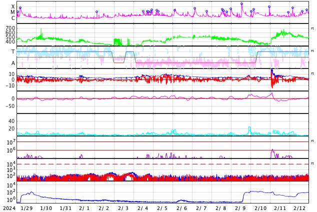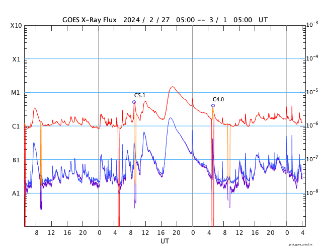 GOES衛星の太陽X線強度。赤・橙 = 0.1〜0.8 nm、青・紫 = 0.05〜0.4 nm (c) データ:NOAA/SWPC、作図:宇宙天気ニュース ![]() | ||||||||||||||||||||||||||||||||||||||||||||||||||||||||||||||||||||||||||||||||||||||||||||||||||||||||||||||||||||||||||||||||||||||||||||||||||||||||||||||||||||||||||||||||||||||||||||||||||||||||||||||||||||||||||||||||||||||||||||||||||||||||||||