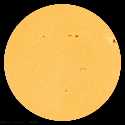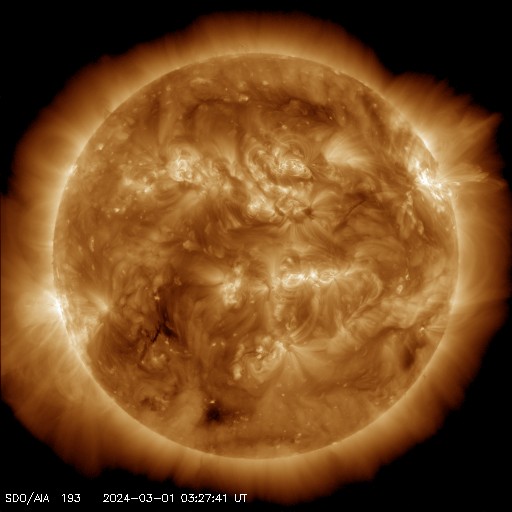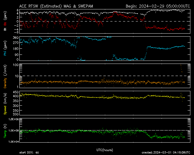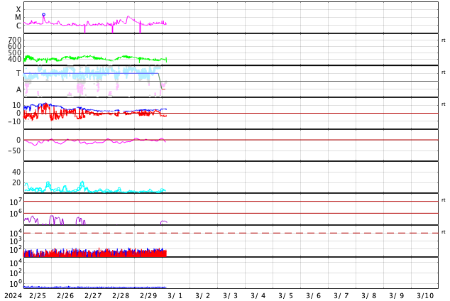 2024/ 3/ 1 13:11 更新 太陽風は平均的な状態で、磁気圏も穏やかです。 担当 篠原 太陽風は、速度は390km/秒前後と 平均的な速さで推移しています。 磁場強度は、4nTから5nTへ少し上がっていますが、 こちらも平均的な状態です。 磁場の南北成分は、 グラフの前半は南北に細かく変化して、中盤は北寄りに、 そして後半は南向きの-4nT程度になっています。 磁気圏は基本的には穏やかですが、 グラフの最後は300nT程度の小規模の変化が発生しています。 SDO衛星AIA1393では、コロナホールは特に見られず、 太陽風は穏やかな状態が続きそうです。 3590黒点群は、北西の端(右上)に近付いていて、 この後沈んで行きます。 今朝、C3.8とC3.9の小規模フレアを起こしています。 一方、南東の端(左下)の少し向こう側に活動的な領域がある様で、 C4.0、C2.5などの小規模フレアが発生しています。 この後、どの様な領域が現れるでしょうか。
