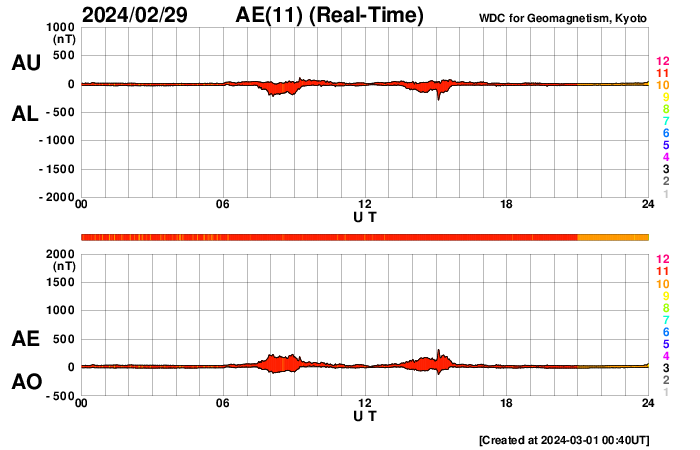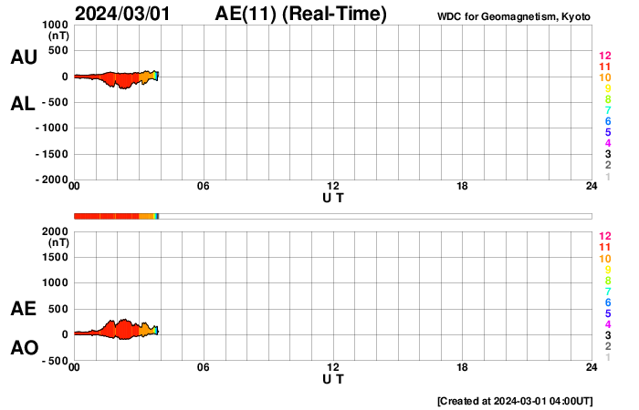 (c) SDO (NASA) ![]() SDO衛星による太陽の可視光写真。マウスの矢印を写真に重ねると、黒点番号付きの写真に切り替わります。 (c) SDO (NASA) ![]() ACEが観測した太陽風の磁場(1番上の枠、白線は全体の強度、赤線は南北成分) および、太陽風の密度(3番目の橙線)、速度(4番目の黄線) (c) NOAA/SWPC ![]() AE指数(速報値) 下段のAEグラフの値が高くなると、オーロラ活動が活発化しています。 (c) 京都大学WDC ![]() ![]() 27日の太陽周期に合わせた図 太陽が同じ面を地球に向けていた27日前の変化から、今後を予想することができます。 (c) 作図:宇宙天気ニュース