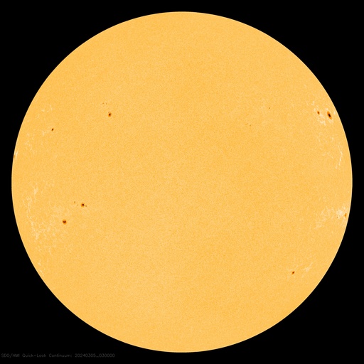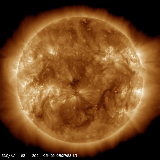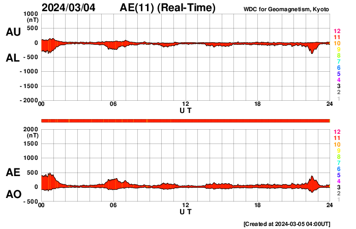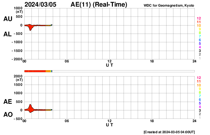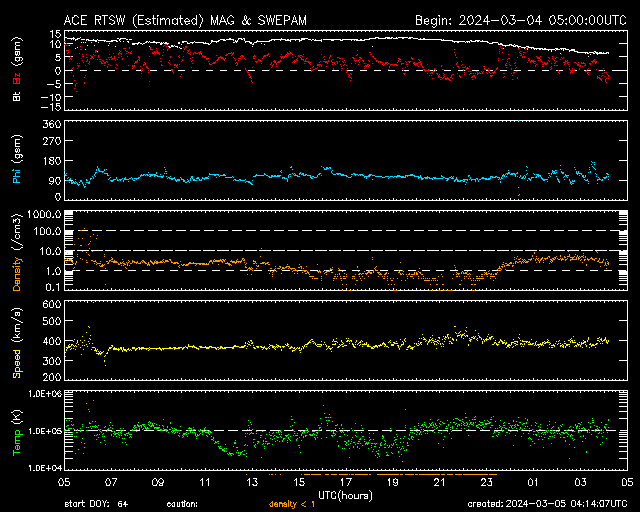 2024/ 3/ 5 13:15 更新 太陽風の磁場の強まりは終わっています。速度はやや低速です。 担当 篠原 昨日のニュース以降も太陽風磁場の強まりは続き、 今朝、5日8時(世界時4日23時)頃まで 10nT付近で推移していました。 その後ゆっくりと下がって、 現在は6nTと平均的な状態に戻っています。 太陽風の速度は、350km/秒から少し上がっていますが、 380km/秒とやや低速の状態です。 太陽風磁場の南北成分は、 昨日のニュース以降は北寄りの傾向が続いています。 磁気圏は穏やかに推移していて、 AE指数は、時々小規模の変化が発生する程度です。 SDO衛星AIA193では、コロナホールは特に見えていません。 この後、太陽風は穏やかな状態が続きそうです。 太陽は、穏やかに推移しています。 X線グラフは変化が少なく、 C1台の小さい小規模フレアが発生した程度です。 ![]() SDO衛星のAIA193カメラによる太陽コロナの様子 (c) SDO (NASA) ![]() SDO衛星による太陽の可視光写真。マウスの矢印を写真に重ねると、黒点番号付きの写真に切り替わります。 (c) SDO (NASA) ![]() ACEが観測した太陽風の磁場(1番上の枠、白線は全体の強度、赤線は南北成分) および、太陽風の密度(3番目の橙線)、速度(4番目の黄線) (c) NOAA/SWPC ![]() AE指数(速報値) 下段のAEグラフの値が高くなると、オーロラ活動が活発化しています。 (c) 京都大学WDC ![]() ![]() 27日の太陽周期に合わせた図 太陽が同じ面を地球に向けていた27日前の変化から、今後を予想することができます。 (c) 作図:宇宙天気ニュース