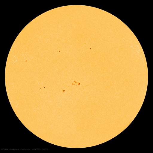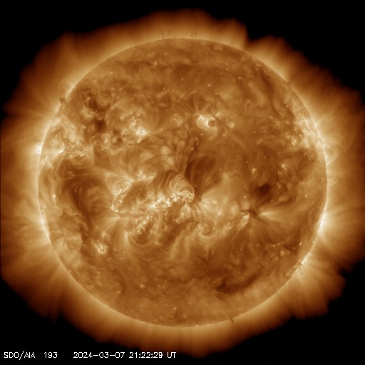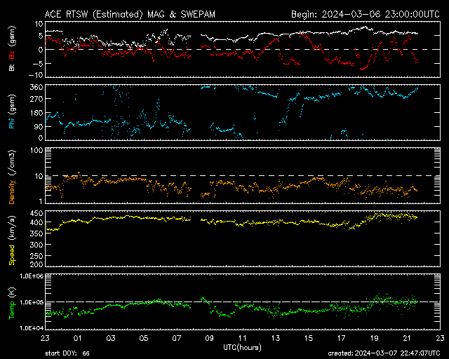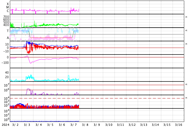 2024/ 3/ 8 07:47 更新 太陽風は平均的な状態です。3599黒点群の活動が少し強まっています。 担当 篠原 太陽風は、400km/秒前後と平均的な速度で推移しています。 磁場強度は、グラフの前半は3nTに少し下がっていましたが、 後半は5nTと平均的な状態に戻っています。 磁場の南北成分は、 グラフの後半から南北の変化が少し大きくなり、 -5nT程度の南向きの変化が度々発生しています。 このため、磁気圏の活動も少し強まって、 AE指数は、700nT程度の中規模の変化が 2回ほど発生しています。 この後も南北の変化は続くでしょうか。 SDO衛星AIA193の太陽コロナ写真では、 コロナホールは特に見えていません。 太陽風は、基本的には穏やかな状態が続きそうです。 太陽は、中心部の3599黒点群の活動度が少し高まり、 C8.3、C4.0、C6.3などの小規模フレアが発生しています。 X線グラフは変化が見られる様になっています。 可視光写真を見ると、 3599群は昨日よりも黒点が増えています。 更に発達が続くのか、この後の状態に注目して下さい。 今朝の種子島は、風が強くて外は寒そうです。 今日は屋内の活動なので良いのですが、 明日は外でロケットの打ち上げなどを行うので、 早く風が落ち着いて欲しいところです。