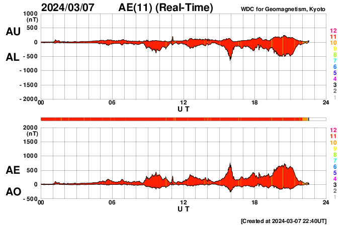 (c) SDO (NASA) ![]() SDO衛星による太陽の可視光写真。マウスの矢印を写真に重ねると、黒点番号付きの写真に切り替わります。 (c) SDO (NASA) ![]() ACEが観測した太陽風の磁場(1番上の枠、白線は全体の強度、赤線は南北成分) および、太陽風の密度(3番目の橙線)、速度(4番目の黄線) (c) NOAA/SWPC ![]() AE指数(速報値) 下段のAEグラフの値が高くなると、オーロラ活動が活発化しています。 (c) 京都大学WDC ![]() 27日の太陽周期に合わせた図 太陽が同じ面を地球に向けていた27日前の変化から、今後を予想することができます。 (c) 作図:宇宙天気ニュース