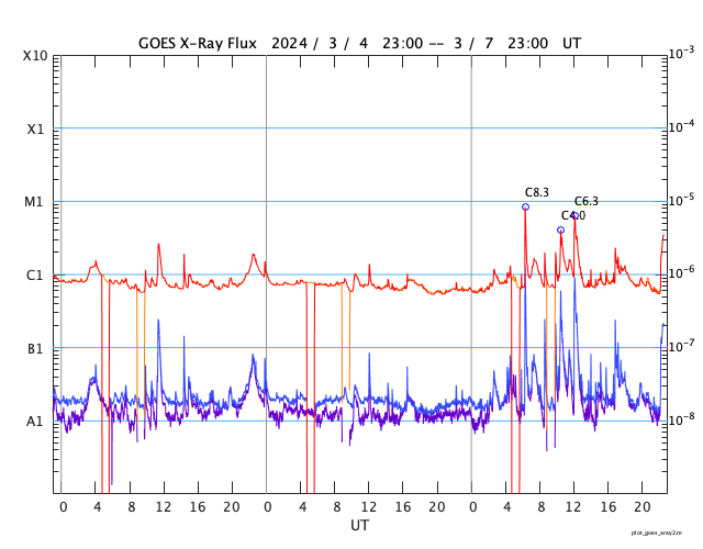 GOES衛星の太陽X線強度。赤・橙 = 0.1〜0.8 nm、青・紫 = 0.05〜0.4 nm (c) データ:NOAA/SWPC、作図:宇宙天気ニュース ![]() | ||||||||||||||||||||||||||||||||||||||||||||||||||||||||||||||||||||||||||||||||||||||||||||||||||||||||||||||||||||||||||||||||||||||||||||||||||||||||||||||||||||||||||||||||||||||||||||||||||||||||||||||||||||||||||||||||||||||||||||||||||||||||||