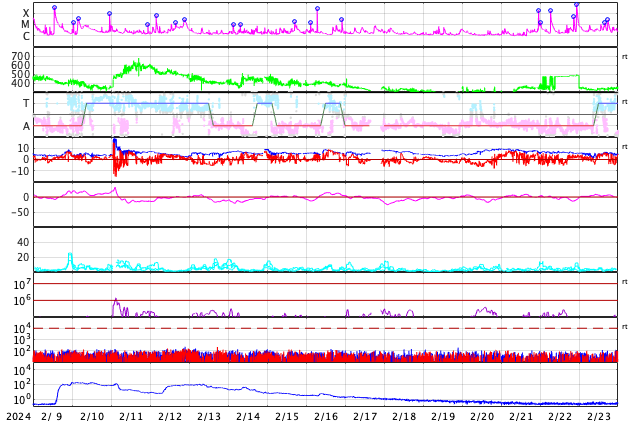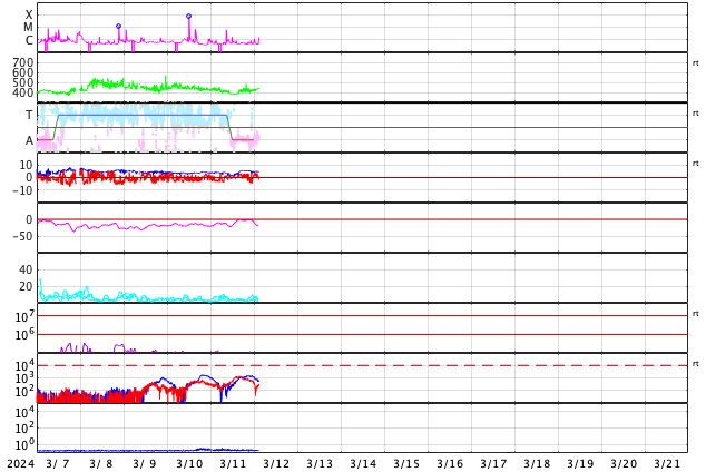 - 2024/ 3/10 12:48 太陽風は平均的な状態です。フレアは少なくなっています。