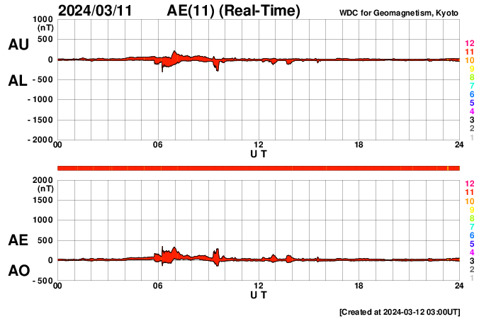 下段のAEグラフの値が高くなると、オーロラ活動が活発化しています。