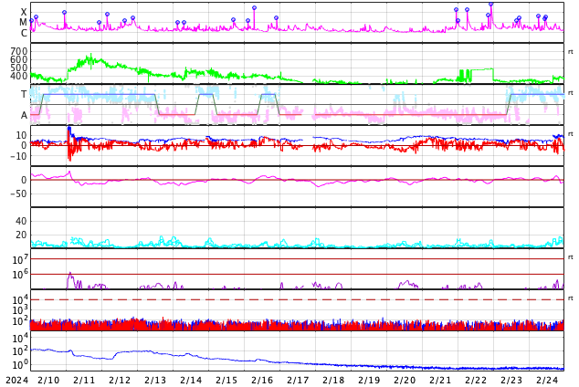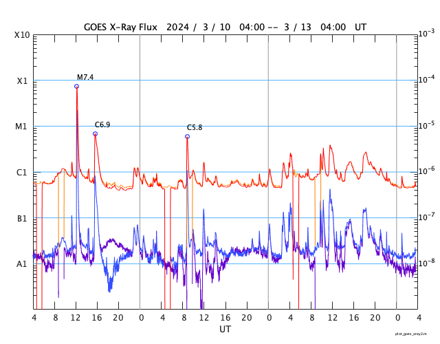 GOES衛星の太陽X線強度。赤・橙 = 0.1〜0.8 nm、青・紫 = 0.05〜0.4 nm (c) データ:NOAA/SWPC、作図:宇宙天気ニュース ![]() | ||||||||||||||||||||||||||||||||||||||||||||||||||||||||||||||||||||||||||||||||||||||||||||||||||||||||||||||||||||||||||||||||||||||||||||||||||||||||||||||||||||||||||||||||||||||||||||||||||||||||||||||||||||||||||||||||||||||||||||||||||||