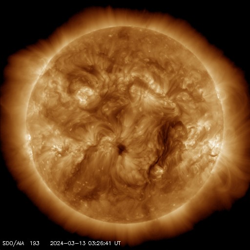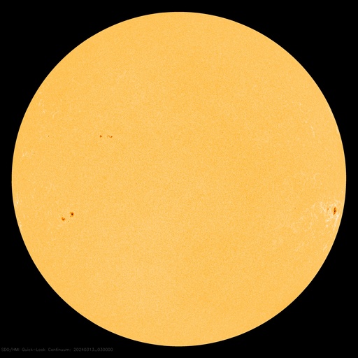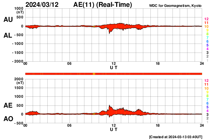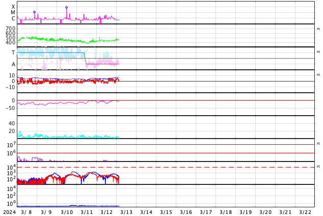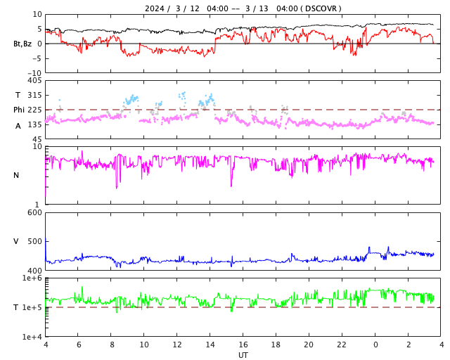 2024/ 3/13 12:49 更新 太陽風は平均的な状態で、磁気圏も穏やかです。 担当 篠原 今日の太陽風は、DSCOVR衛星のグラフを掲載しています。 速度は、430〜450km/秒と 平均的な速さで推移している様です。 磁場強度は、5nTから7nTへ少し上がっていますが、 こちらも平均的な状態です。 磁場の南北成分は、グラフの途中で南向きになっていますが、 その他は北寄りで推移しています。 磁気圏の活動もこれに対応して、 AE指数は、グラフの途中で300〜500nTの小規模の変化が発生して、 その後は穏やかになっています。 太陽風は、この後も穏やかな状態が続きそうです。 太陽は、南西の端(右下)に近付いた3599黒点群で、 C1〜3の小規模フレアが頻繁に発生しています。 また、南東の端(左下)の少し向こう側で C3.3の小規模フレアが発生しました。 この後も活動が見られるでしょうか。