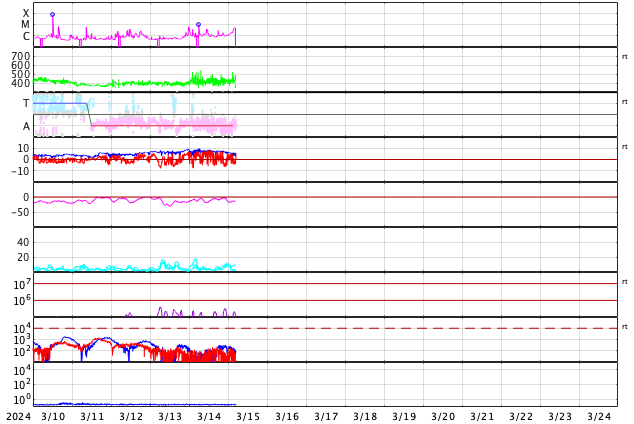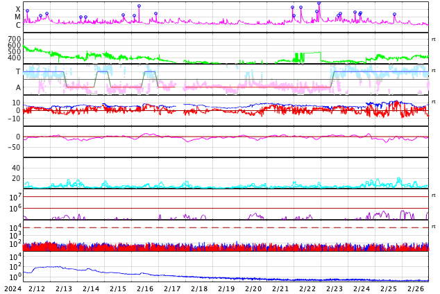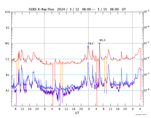 GOES衛星の太陽X線強度。赤・橙 = 0.1〜0.8 nm、青・紫 = 0.05〜0.4 nm (c) データ:NOAA/SWPC、作図:宇宙天気ニュース ![]() | |||||||||||||||||||||||||||||||||||||||||||||||||||||||||||||||||||||||||||||||||||||||||||||||||||||||||||||||||||||||||||||||||||||||||||||||||||||||||||||||||||||||||||||||||||||||||||||||||||||||||||||||||||||||||||||||||||||||||||||||||
