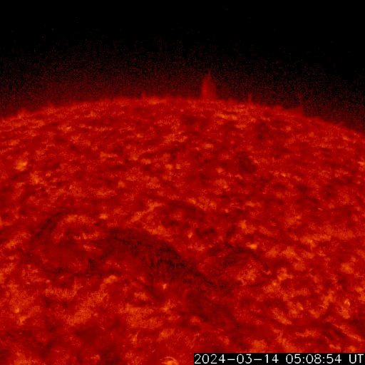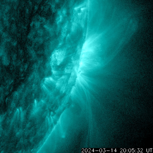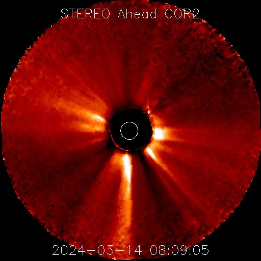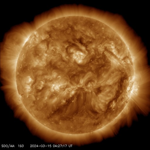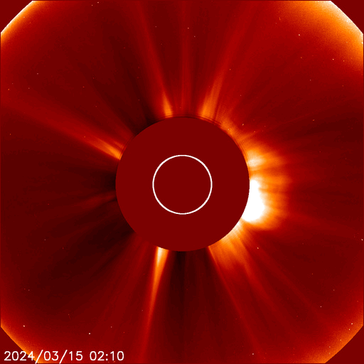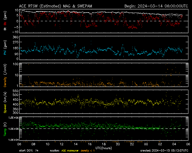 2024/ 3/15 14:11 更新 太陽風は平均的な状態です。太陽は穏やかに推移しそうです。 担当 篠原 太陽風は、速度は400〜420km/秒と平均的な状態が続き、 磁場強度は、初めは8nTとやや強まっていましたが、 グラフの最後は5nTと平均的な値に戻っています。 太陽風磁場の南北成分は、 全体としては北寄りの傾向になっていますが、 時々、-5nTと南向きの強まりが発生しています。 この頃に磁気圏の活動が強まって、 AE指数では、300nTの小規模の高まりと、 900nTの中規模の高まりが発生しています。 その他の時間帯では、磁気圏は穏やかです。 太陽では、昨夕、14日17時(世界時14日8時)頃に、 北側でフィラメント噴出が発生しています。 SDO衛星AIA304の動画を掲載します。 これにより、太陽の上に向かって CME(コロナ質量放出)が発生しています。 南西の端(右下)に達した3599黒点群は、 14日15時(世界時14日6時)にM1.0の中規模フレア、 その後、C4.0、C3,0などの小規模フレアが発生し 向こう側に進んでいきました。 そして、15日11時(世界時15日2時)頃に、 この領域でフレアが発生した様で、 X線の強度がC4程度に高まり、 SDO衛星AIA131ではコロナが輝く様子が見えています。 SOHO衛星LASCO C2では、 太陽の右側に飛び出すCMEが観測されています。 太陽のこちら側は黒点が少なくなっていて、 この後は、穏やかな状態になりそうです。 ![]() 太陽の北側で発生したフィラメント噴出。 (c) SDO衛星AIA304、(動画加工 : 宇宙天気ニュース) ![]() 太陽の上へ向飛び出すCME。 (c) STEREO Ahead衛星COR2 (NASA)、(動画加工 : 宇宙天気ニュース) ![]() 南西の端の向こう側に進んだ3599黒点群でフレアが発生した様です。 (c) SDO衛星AIA131 (NASA)、(動画加工 : 宇宙天気ニュース) ![]() 太陽の右側へ飛び出すCME。 (c) SOHO衛星LASCO C2 (ESA & NASA)、(動画加工 : 宇宙天気ニュース) ![]() SDO衛星のAIA193カメラによる太陽コロナの様子 (c) SDO (NASA) ![]() SDO衛星による太陽の可視光写真。マウスの矢印を写真に重ねると、黒点番号付きの写真に切り替わります。 (c) SDO (NASA) ![]() ACEが観測した太陽風の磁場(1番上の枠、白線は全体の強度、赤線は南北成分) および、太陽風の密度(3番目の橙線)、速度(4番目の黄線) (c) NOAA/SWPC ![]() AE指数(速報値) 下段のAEグラフの値が高くなると、オーロラ活動が活発化しています。 (c) 京都大学WDC ![]() ![]() 27日の太陽周期に合わせた図 太陽が同じ面を地球に向けていた27日前の変化から、今後を予想することができます。 (c) 作図:宇宙天気ニュース