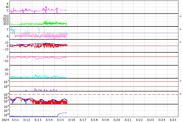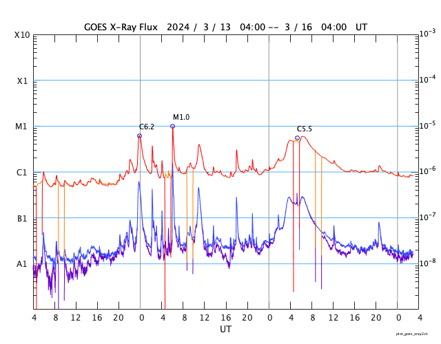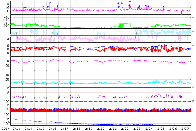 GOES衛星の太陽X線強度。赤・橙 = 0.1〜0.8 nm、青・紫 = 0.05〜0.4 nm (c) データ:NOAA/SWPC、作図:宇宙天気ニュース ![]() | ||||||||||||||||||||||||||||||||||||||||||||||||||||||||||||||||||||||||||||||||||||||||||||||||||||||||||||||||||||||||||||||||||||||||||||||||||||||||||||||||||||||||||||||||||||||||||||||||||||||||||||||||||||||||||||||||||||||||||