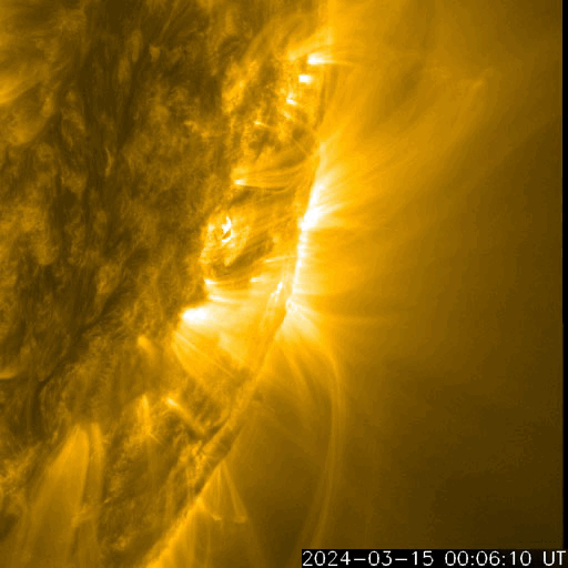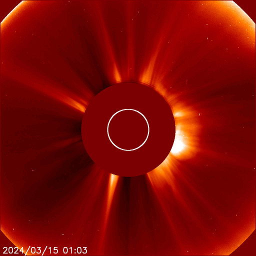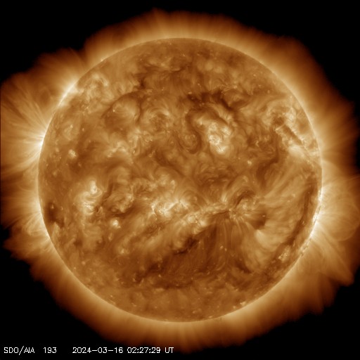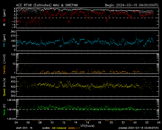2024/ 3/16 12:08 更新 太陽風は平均的な状態です。太陽も穏やかです。 担当 篠原 太陽風は、速度は400km/秒で安定し、 磁場強度は6nTからゆっくりと4nTへ下がっています。 どちらも平均的な状態です。 磁場の南北成分は、グラフの初めは南寄りでしたが、 以降は北寄りになっています。 このため磁気圏は穏やかで、 AE指数は変化のない状態です。 SDO衛星AIA193の太陽コロナ写真は、 コロナホールは特に見えていません。 太陽風は穏やかな状態が続きそうです。 太陽は、昨日のニュースで紹介した、 南西の端(右下)の向こう側に進んだ 3599黒点群で発生したと思われる 15日11時(世界時15日2時)頃のフレアに続いて、 SDO衛星AIA171で、 ポスト・フレアループがきれいに見えていました。 今朝にかけての動画を掲載します。 また、この時に発生したCME(コロナ質量放出)のその後の広がりを、 SOHO衛星LASCO C2、C3の動画で紹介します。 太陽の右下への広がりの後に、 下向きに飛び出すCMEも見えています。 一方、太陽のこちら側では特に活動はなく、 太陽は穏やかです。