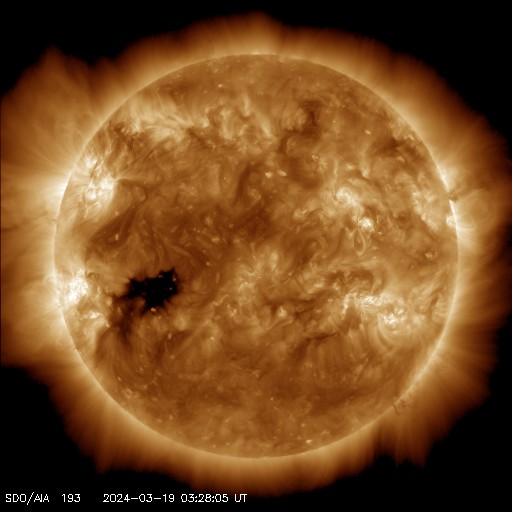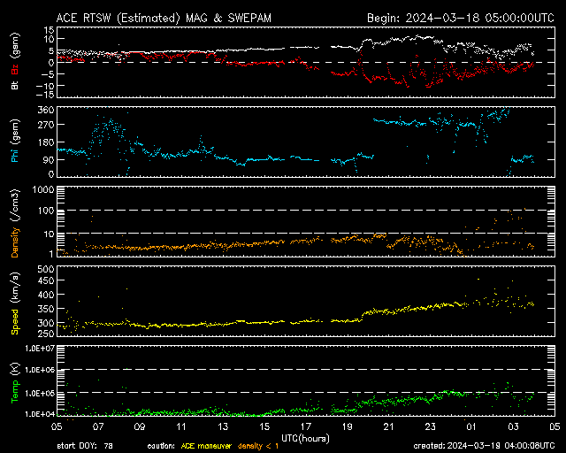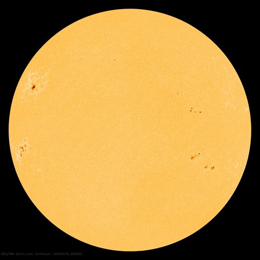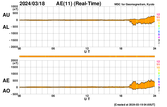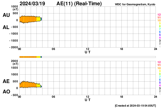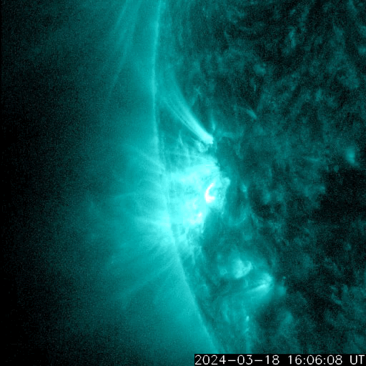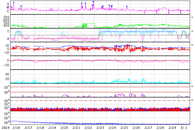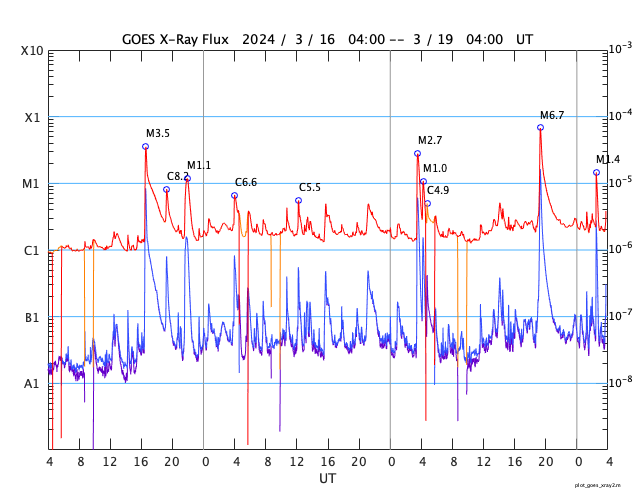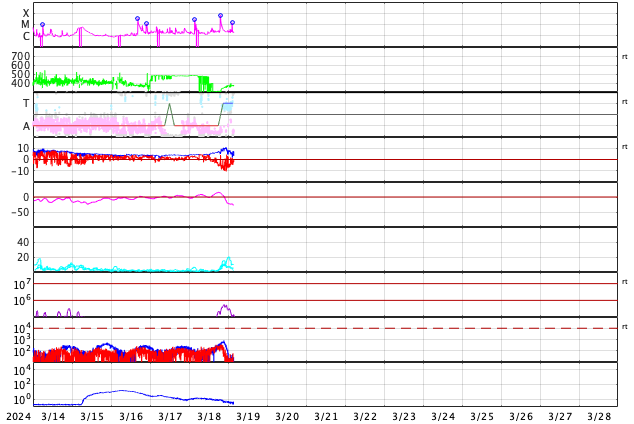 2024/ 3/19 13:00 更新 M6.7の中規模フレアが発生しました。太陽風の小さい強まりが到来しました。 担当 篠原 今朝、19日4時(世界時18日19時)に、 太陽の南東の端近く(左下)の3615黒点群で、 M6.7の中規模フレアが発生しました。 SDO衛星AIA131の動画を掲載します。 3615群では、19日11時半(世界時19日2時半)にも M1.4の中規模フレアが発生しています。 この後も活動が続きそうです。 注目してください。 北東側(左上)の3614群でも、 M1.0の中規模フレア、 C5.1の小規模フレアが発生しています。 こちらはどう推移するでしょうか。 太陽風は、今朝、19日4時半(世界時18日19時半)に、 小規模の強まりが到来し、 速度は、300km/秒から340km/秒へ、 磁場強度は、5nTから10nTへ、 それぞれ高まっています。 現在は、速度は360km/秒と低速の状態が続き、 磁場強度は5nTと平均的な値に戻っています。 この強まりの時に、磁場の南北成分が-5nTを超えて、 -10nTくらいまで南向きに変化しました。 速度が下がっているので影響は限定的でしたが、 AE指数は500nTに達するくらいの小規模の変化が 連続的に発生しています。 現在は磁場強度が下がり、 南向きの変化は小さくなっているので、 磁気圏の変化も小さくなっていくでしょう。 SDO衛星AIA193では、 南東のコロナホールが右へ進んでいます。 この広がりにも注目してください。 ![]() 3615黒点群で発生したM6.7の中規模フレア。 (c) SDO衛星AIA131 (NASA)、(動画加工 : 宇宙天気ニュース) ![]() SDO衛星のAIA193カメラによる太陽コロナの様子 (c) SDO (NASA) ![]() SDO衛星による太陽の可視光写真。マウスの矢印を写真に重ねると、黒点番号付きの写真に切り替わります。 (c) SDO (NASA) ![]() GOES衛星の太陽X線強度。赤・橙 = 0.1〜0.8 nm、青・紫 = 0.05〜0.4 nm (c) データ:NOAA/SWPC、作図:宇宙天気ニュース ![]() ACEが観測した太陽風の磁場(1番上の枠、白線は全体の強度、赤線は南北成分) および、太陽風の密度(3番目の橙線)、速度(4番目の黄線) (c) NOAA/SWPC ![]() AE指数(速報値) 下段のAEグラフの値が高くなると、オーロラ活動が活発化しています。 (c) 京都大学WDC ![]() ![]() 27日の太陽周期に合わせた図 太陽が同じ面を地球に向けていた27日前の変化から、今後を予想することができます。 (c) 作図:宇宙天気ニュース
