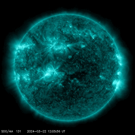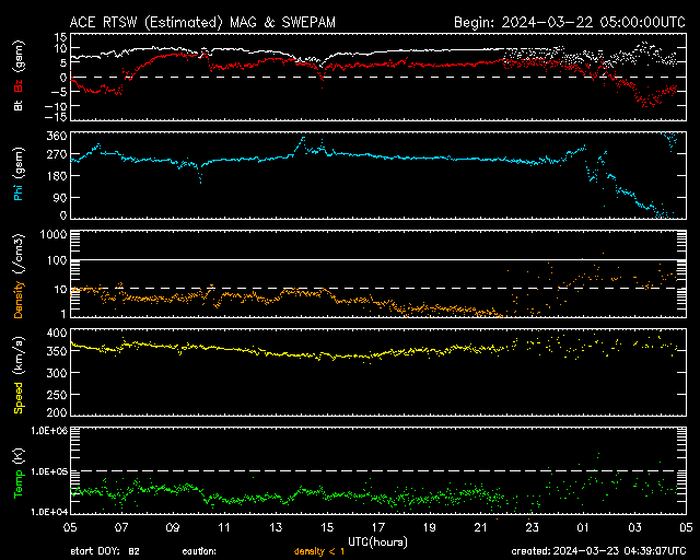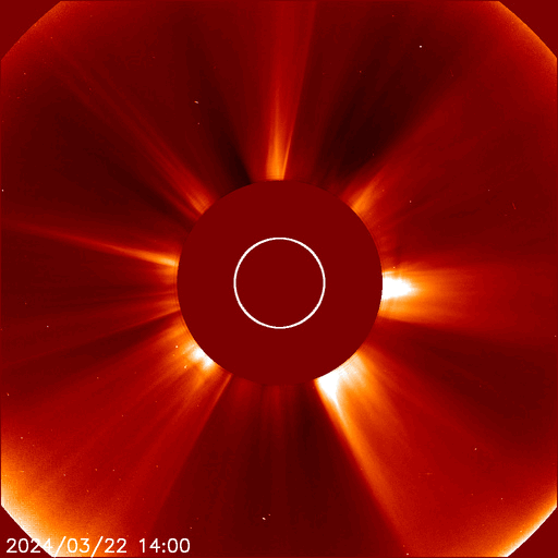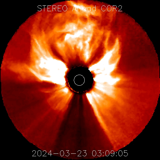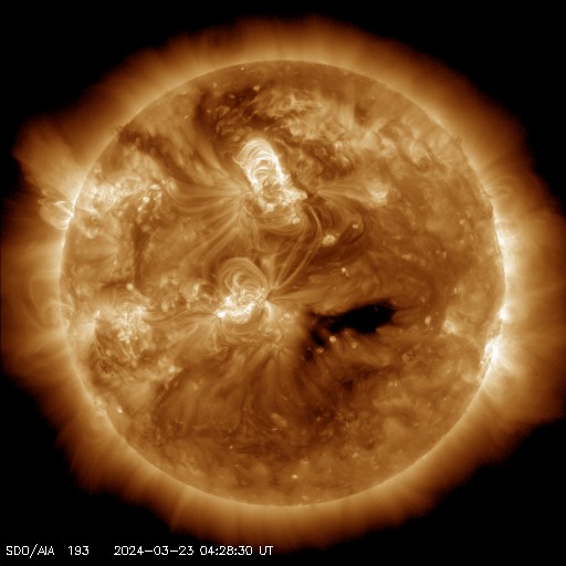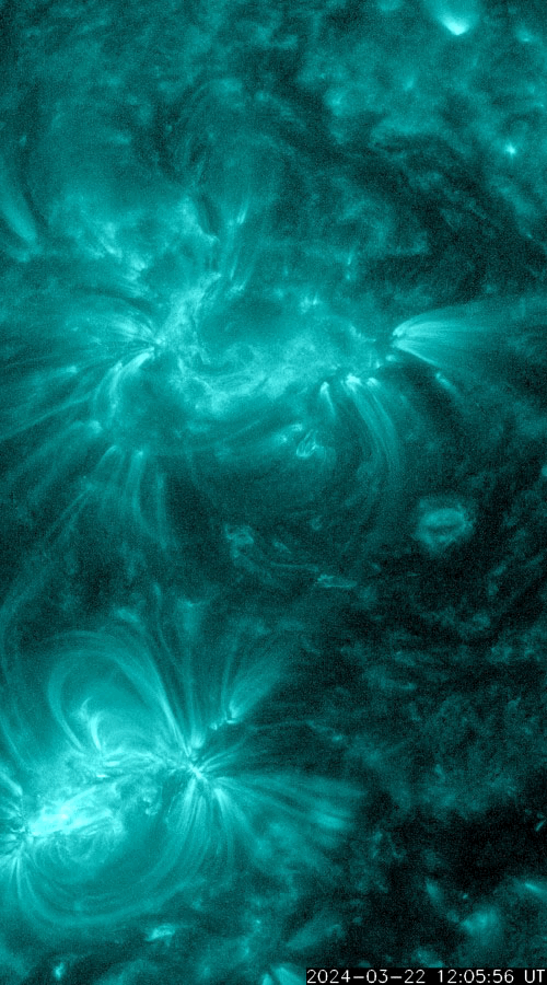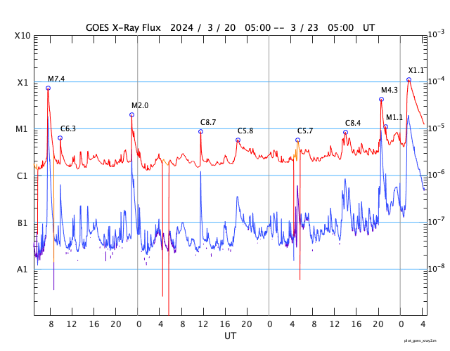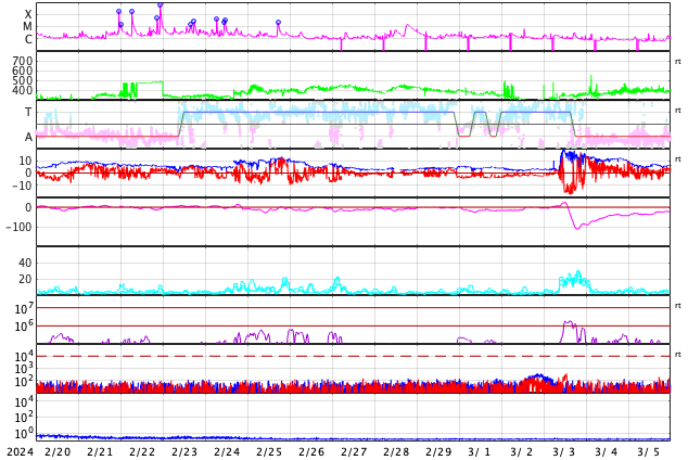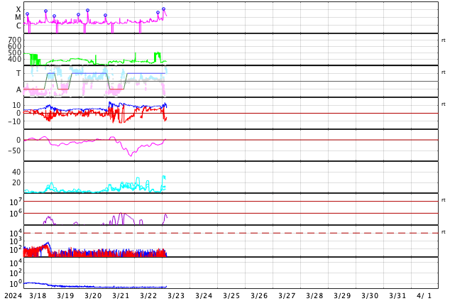 2024/ 3/23 13:40 更新 X1.1の大規模フレアが発生しました。太陽風の乱れが到来しそうです。 担当 篠原 23日10時(世界時23日1時)に、 X1.1の大規模フレアが発生しました。 初めに中心部北側の3614黒点群で輝きが始まり、 続く様に中心部南側の3615群で輝きが発生しています。 X線強度が最大に達した23日10時半(世界時23日1時半)頃は、 両方が明るく輝いています。 フレアの様子をSDO衛星AIA131の動画で紹介します。 2つの領域が見える様に、1枚目の拡大動画は縦長にしています。 動画は、昨夜に3614群で発生した C6.0、C6.2、C8.4の小規模フレアから始まっています。 その後、3615群で、M4.2、M1.1の中規模フレアが発生し、 3614群と3615群で一斉にX1.1の輝きが始まります。 動画の前半のC8.4フレアの時のCME(コロナ質量放出)の様子を、 SOHO衛星LASCO C2、C3の動画で紹介します。 太陽から上向きに飛び出しているので、 地球への影響はありません。 そして、X1.1フレアでは、激しいCMEが発生した様です。 まだ発生直後なので画像がそろっていないのですが、 STEREO Ahead衛星COR2による部分的な動画を掲載します。 太陽全体を丸く囲むようにガスが広がっています。 フルハロー型のCMEになっている様です。 太陽風の乱れは地球へ向かっている様です。 2日程度でやって来ると考えると、 明後日、25日の朝から夕方にかけてくらいでしょうか。 この後の情報に注目してください。 太陽風は、速度は350〜370km/秒と低速の状態が続いている様です。 磁場強度は、8〜10nTとやや強めの状態が続き、 グラフの最後は5〜10nTでやや不安定なデータになっています。 磁気圏は静穏になっていて、 AE指数は変化が見られなくなっています。 SDO衛星AIA131では、 コロナホールが太陽の西側に更に進んでいます。 明日くらいからこの領域の影響で太陽風の速度が高まりそうです。 CMEによる乱れとともに、こちらの変化にも注目してください。