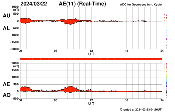 (c) SDO衛星AIA131 (NASA)、(動画加工 : 宇宙天気ニュース) ![]() X1.1の大規模フレアなど、3614群と3615群の活動の様子。 (c) SDO衛星AIA131 (NASA)、(動画加工 : 宇宙天気ニュース) ![]() 太陽の上側へ飛び出すCME。 (c) SOHO衛星LASCO C2、C3 (ESA & NASA)、(動画加工 : 宇宙天気ニュース) ![]() 太陽を丸く囲むように広がるフルハロー型のCMEが発生しています。 (c) STEREO Ahead衛星COR2 (NASA)、(動画加工 : 宇宙天気ニュース) ![]() SDO衛星のAIA193カメラによる太陽コロナの様子 (c) SDO (NASA) ![]() SDO衛星による太陽の可視光写真。マウスの矢印を写真に重ねると、黒点番号付きの写真に切り替わります。 (c) SDO (NASA) ![]() GOES衛星の太陽X線強度。赤・橙 = 0.1〜0.8 nm、青・紫 = 0.05〜0.4 nm (c) データ:NOAA/SWPC、作図:宇宙天気ニュース ![]() ACEが観測した太陽風の磁場(1番上の枠、白線は全体の強度、赤線は南北成分) および、太陽風の密度(3番目の橙線)、速度(4番目の黄線) (c) NOAA/SWPC ![]() AE指数(速報値) 下段のAEグラフの値が高くなると、オーロラ活動が活発化しています。 (c) 京都大学WDC ![]() ![]() 27日の太陽周期に合わせた図 太陽が同じ面を地球に向けていた27日前の変化から、今後を予想することができます。 (c) 作図:宇宙天気ニュース