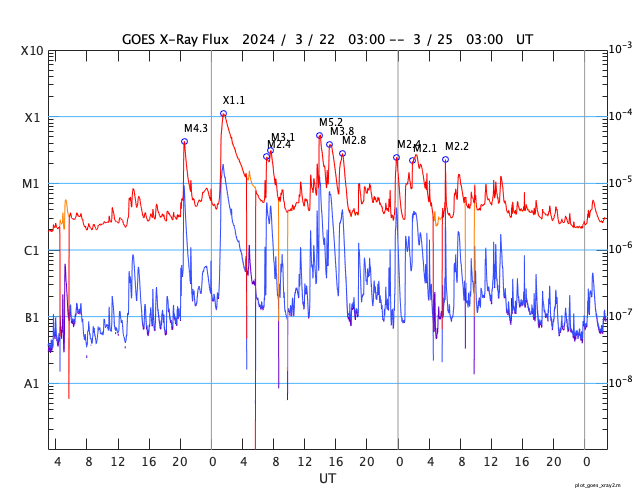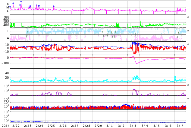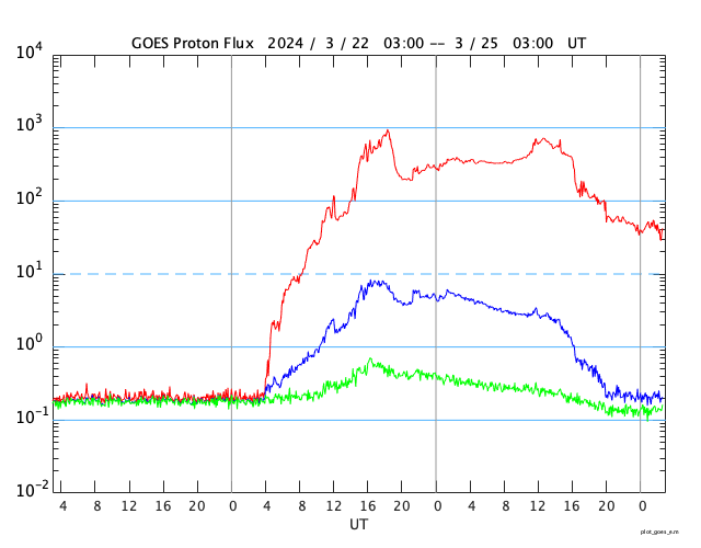 GOES衛星の太陽X線強度。赤・橙 = 0.1〜0.8 nm、青・紫 = 0.05〜0.4 nm (c) データ:NOAA/SWPC、作図:宇宙天気ニュース ![]() GOES衛星による、静止衛星軌道における高エネルギー陽子の変化 (c) データ:NOAA/SWPC、作図:宇宙天気ニュース ![]() | |||||||||||||||||||||||||||||||||||||||||||||||||||||||||||||||||||||||||||||||||||||||||||||||||||||||||||||||||||||||||||||||||||||||||||||||||||||||||||||||||||||||||||||||||||||||||||||||||||||||||||||||||||||||||||||||||||||||||||||||||||||||||||||||||||||||||||||||||||||||||||||||||||||||||||||||||||||||||||||||||||||||||||||||||||||||||||||||||||||||||||||||||||||