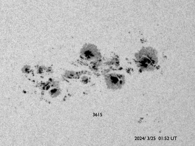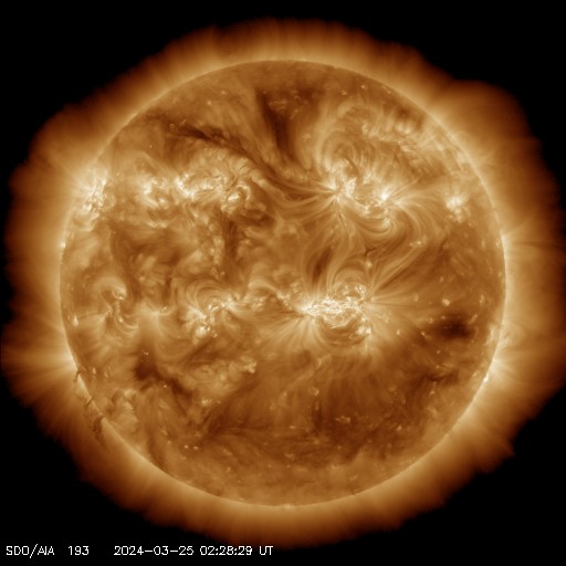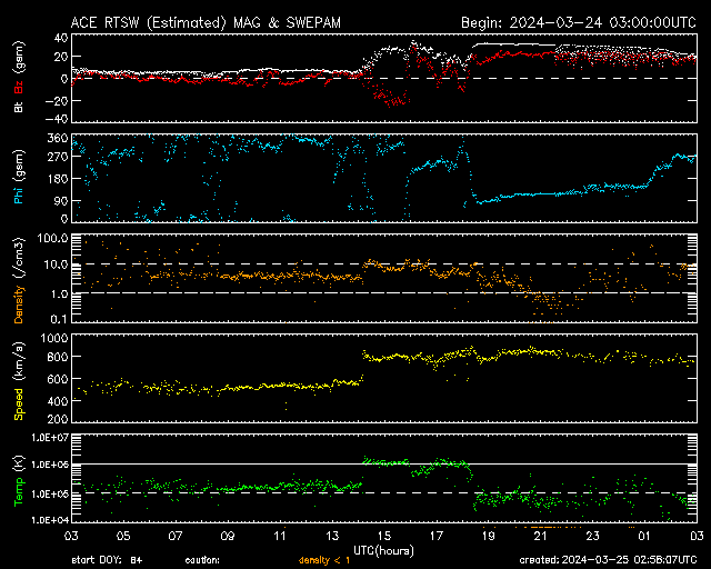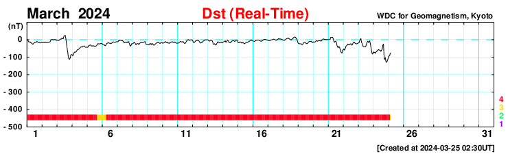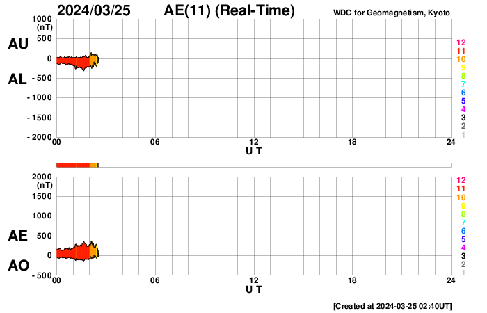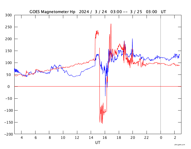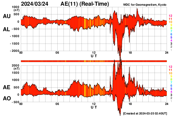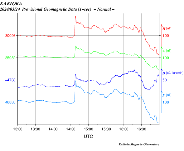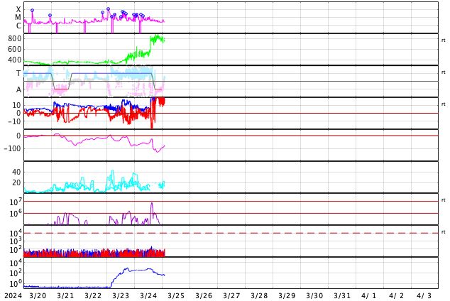 2024/ 3/25 11:59 更新 太陽風の強い乱れが到来し、磁気圏の活動が一時的に激しくなりました。 担当 篠原 昨夜遅く、24日23時20分(世界時24日14時20分)頃に、 太陽風の急な強まりがACE衛星で観測されました。 速度は、550km/秒から800km/秒へ上がってかなり高速になり、 磁場強度は、7nTから20nT、 そして30nTとかなり強い状態になりました。 23日の昼に発生したX1.1の大規模フレアの時の CME(コロナ質量放出)による太陽風の強まりだと思われます。 その場合、乱れは1日半で地球へやって来たことになり、 昨日紹介したNOAA/SWPCの予報よりも半日早くなりました。 気象庁地磁気観測所による茨城県柿岡の地上磁場観測では、 24日23時35分(世界時24日14時35分)頃に、 磁場の急な強まりが発生しています。 太陽風の強まりが地球に達して、 磁気圏を強く圧縮したことを示しています。 注目していた太陽風磁場の南北成分は、 乱れの初めに-20nTに達する強い南向きが 1時間ほど発生しています。 速度の高まりもあり、 この影響で磁気圏の活動は非常に激しくなりました。 AE指数は、2500nTに達する激しい変化が発生しています。 ただ、磁場の南向きの変化は短時間で終わり、 25日1時(世界時24日16時)以降は、 ほとんど北向きで推移する様になっています。 現在も+20nTと北向きにとても強まった状態です。 このため、磁気圏の激しい活動は短時間で終わり、 AE指数はすぐに変化が小さくなり、 グラフの最後は300nT程度の変化になっています。 一方、Dst指数の速報値は、磁気圏活動の強まりにより -130nTまで下がり(マイナス方向に強まります)、 大きい磁気嵐が発生しました。 しかし、こちらも現在は-92nTまで戻っていて、 乱れの規模は縮小しています。 太陽風の速度は、乱れが始まって半日過ぎた現在も 760km/秒と高まった状態が続いています。 もし、太陽風磁場の南北方向の変化が反対だった場合は、 -20nTの強い南向きの状態が10時間以上続いたことになります。 その場合は、かなり激しい磁気圏の乱れが発生したでしょう。 今回の太陽風の乱れにより、 昼側にいたGOES衛星の磁場が南向き(マイナス側)になる という変化が観測されています。 静止衛星であるGOES衛星では、 通常は地球磁場の北向き(プラス側)が観測されていますが、 太陽風の強まりによって一時的に太陽風の領域に入ってしまい、 太陽風の南向きの磁場を観測したのです。 太陽風の強まりは、この後どのくらいまで続くでしょうか。 また、磁場の南北成分が南向きに切り替わる変化が 発生するでしょうか。 引き続き注目してください。 太陽は、3615黒点群の活動は次第に落ち着いています。 昨夜まではM1〜2の中規模フレアが数回発生しましたが、 今日に入ってからは、C3〜5の小規模フレアに留まっています。 X線グラフは全体の強度が下がり、 フレアの変化も少なくなっています。 一方、可視光写真では、 3615群は大きい姿を保っています。 フレアの発生はこれで終わるのか、 しばらく休んで再び強まるのか、この後も注目してください。 ![]() 24日23時35分(世界時24日14時35分)頃に地上磁場の急な強まりが観測されました。 (c) 気象庁地磁気観測所 ![]() Dst指数の速報値は、-130nTまで下がっています。 (c) 京都大学WDC ![]() GOES衛星の磁場が一時的に南向きになりました。 (c) データ:NOAA/SWPC、作図:宇宙天気ニュース ![]() 3615黒点群の拡大写真。 (c) SDO衛星HMII (NASA)、作図 : 宇宙天気ニュース ![]() SDO衛星のAIA193カメラによる太陽コロナの様子 (c) SDO (NASA) ![]() SDO衛星による太陽の可視光写真。マウスの矢印を写真に重ねると、黒点番号付きの写真に切り替わります。 (c) SDO (NASA) ![]() ACEが観測した太陽風の磁場(1番上の枠、白線は全体の強度、赤線は南北成分) および、太陽風の密度(3番目の橙線)、速度(4番目の黄線) (c) NOAA/SWPC ![]() AE指数(速報値) 下段のAEグラフの値が高くなると、オーロラ活動が活発化しています。 (c) 京都大学WDC ![]() ![]() 27日の太陽周期に合わせた図 太陽が同じ面を地球に向けていた27日前の変化から、今後を予想することができます。 (c) 作図:宇宙天気ニュース