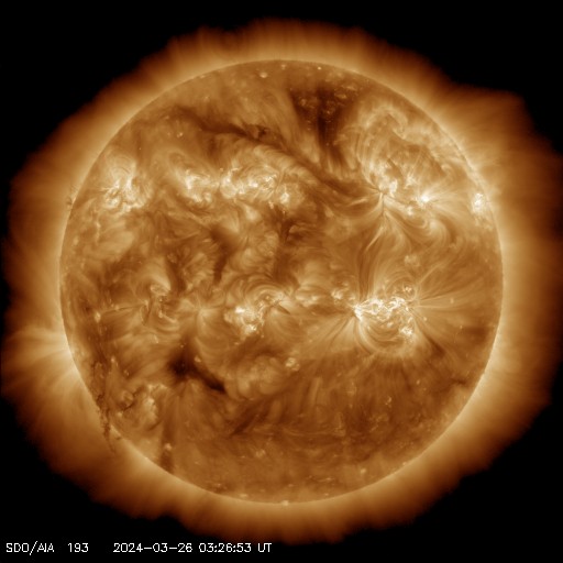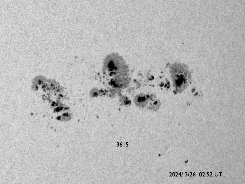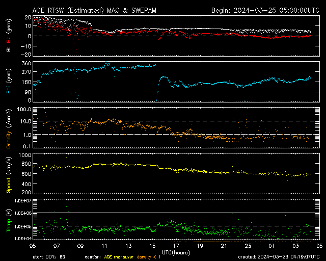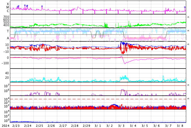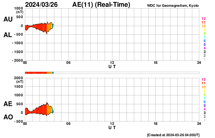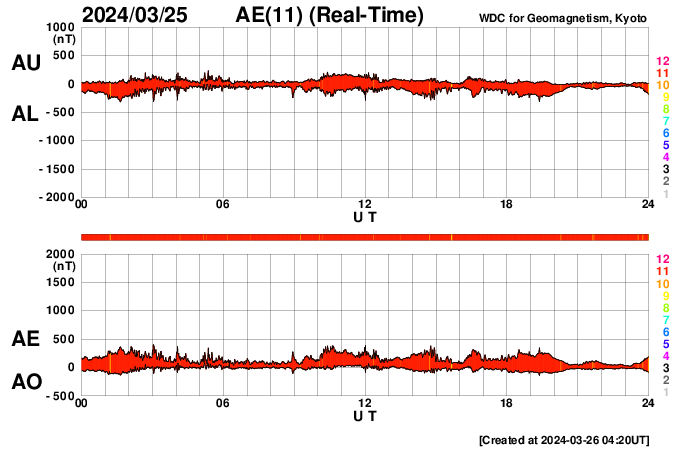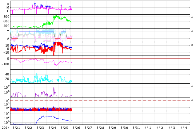 2024/ 3/26 13:20 更新 太陽風の速度は下がりつつあります。磁気圏はやや活動的です。 担当 篠原 太陽風の速度は、今日未明まで700km/秒台と かなり高まった状態が続きましたが、 そこから下がり始め、 現在は550km/秒と普通の高まり程度に戻っています。 磁場強度は、昨夕までは10nTを超えていましたが、 その後は5〜7nTと平均的な状態です。 太陽風の強まりは終わりに近付いている様です。 太陽風磁場の南北成分は、 今朝まで北寄りの状態が続きました。 このため、磁気圏の活動はあまり高まらず、 AE指数は300nTの小規模の変化が続く程度になっています。 今朝以降は、磁場は弱い南寄りになっていますが、 変化は小さく、速度も落ち着いてきたため、 AE指数の変化は500nTと中規模くらいです。 3615黒点群は、M4.4、M1.9と 中規模フレアを2回起こしています。 変化は少なくなっていますが、引き続き注目してください。
