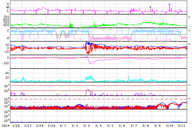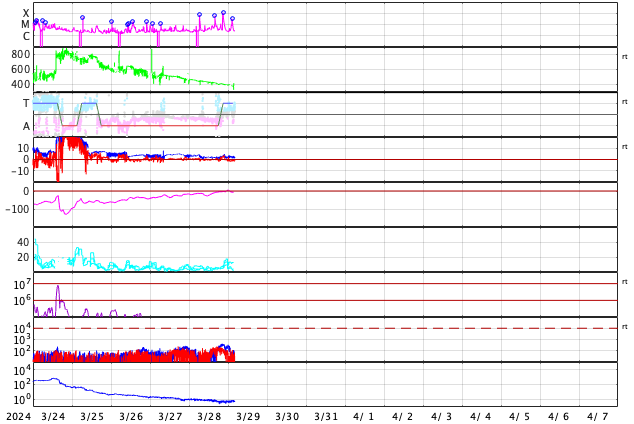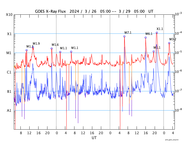 GOES衛星の太陽X線強度。赤・橙 = 0.1〜0.8 nm、青・紫 = 0.05〜0.4 nm (c) データ:NOAA/SWPC、作図:宇宙天気ニュース ![]() | |||||||||||||||||||||||||||||||||||||||||||||||||||||||||||||||||||||||||||||||||||||||||||||||||||||||||||||||||||||||||||||||||||||||||||||||||||||||||||||||||||||||||||||||||||||||||||||||||||||||||||||||||||||||||||||||||||||||||||||||||||||||||||||||||||||||||||||||||||||||||||||||||||||||||||||||||||||||