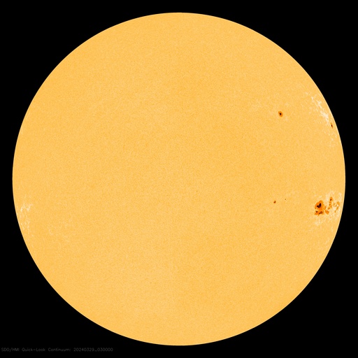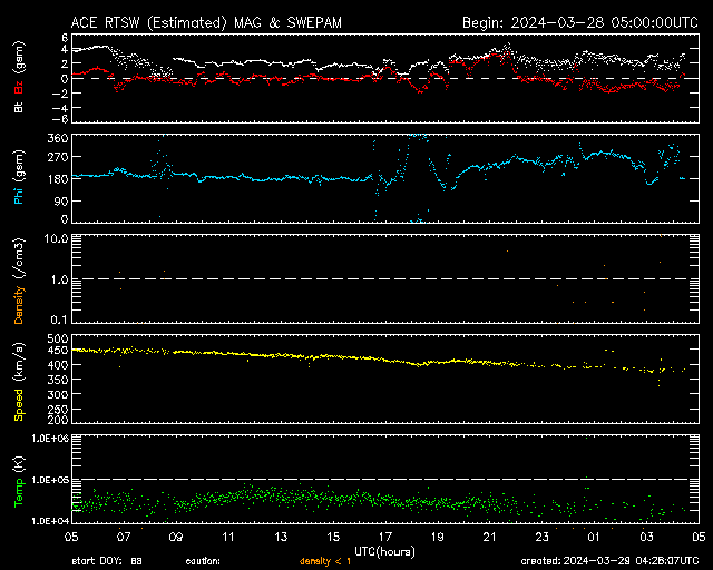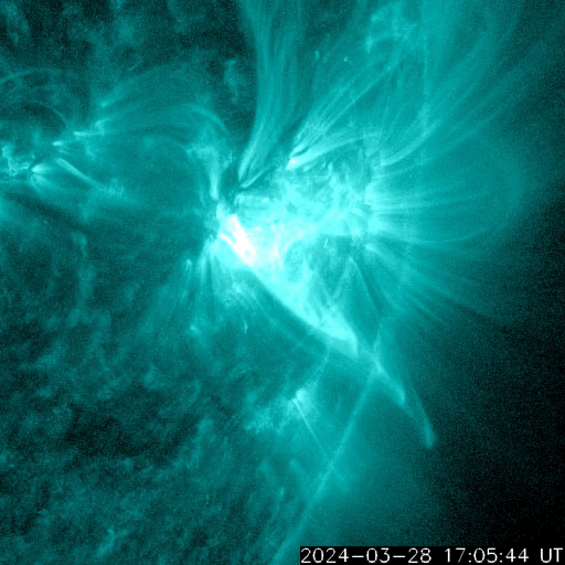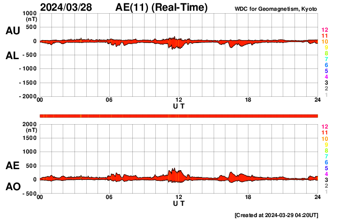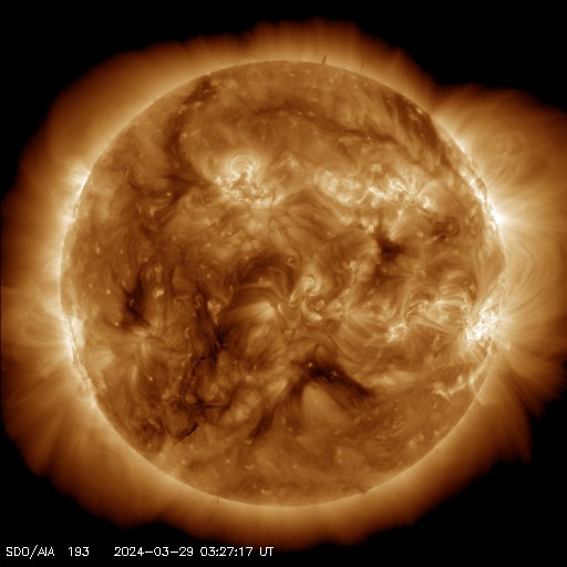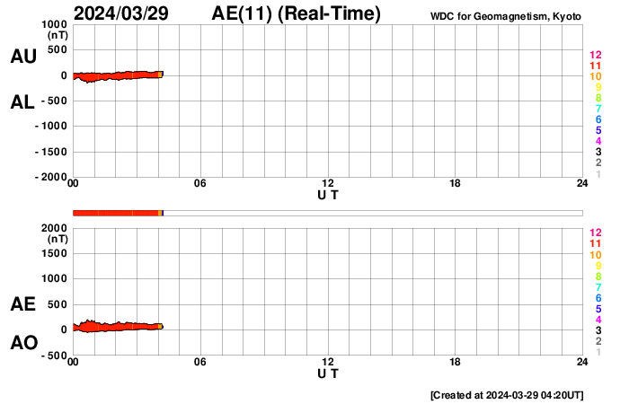 2024/ 3/29 13:30 更新 太陽風はやや低速です。X1.1の大規模フレアが発生しました。 担当 篠原 太陽風は、速度が450km/秒から380km/秒へ下がり、 やや低速になっています。 磁場強度は、2nT前後で推移する様になり、 弱い状態です。 AE指数は小規模の変化が時々発生していますが、 全体としては穏やかな状態です。 この後、太陽風の速度が更に下がって低速になると、 磁気圏はより穏やかになるでしょう。 太陽の南西の端(右下)に近付いた3615黒点群で、 昨日の午後、28日15時半(世界時28日6時半)にM7.1、 29日0時半(世界時28日15時半)にM6.1と 大きめの中規模フレアが発生して、 今朝、29日5時半(世界時28日20時半)に、 X1.1の大規模フレアが発生しました。 Xフレアの発生は、23日以来、一週間ぶりです。 SDO衛星AIA131の動画を掲載します。 3615群では、今日の昼、 29日11時半(世界時29日2時半)にも M3.2の中規模フレアが発生しています。 西の端に沈んで行くまで、注目を続けて下さい。 ![]() 3615黒点群で発生した、X1.1の大規模フレア。 (c) SDO衛星AIA131 (NASA)、(動画加工 : 宇宙天気ニュース) ![]() SDO衛星のAIA193カメラによる太陽コロナの様子 (c) SDO (NASA) ![]() SDO衛星による太陽の可視光写真。マウスの矢印を写真に重ねると、黒点番号付きの写真に切り替わります。 (c) SDO (NASA) ![]() ACEが観測した太陽風の磁場(1番上の枠、白線は全体の強度、赤線は南北成分) および、太陽風の密度(3番目の橙線)、速度(4番目の黄線) (c) NOAA/SWPC ![]() AE指数(速報値) 下段のAEグラフの値が高くなると、オーロラ活動が活発化しています。 (c) 京都大学WDC ![]() ![]() 27日の太陽周期に合わせた図 太陽が同じ面を地球に向けていた27日前の変化から、今後を予想することができます。 (c) 作図:宇宙天気ニュース