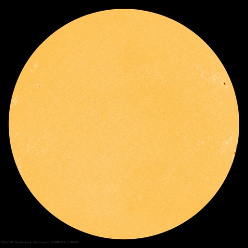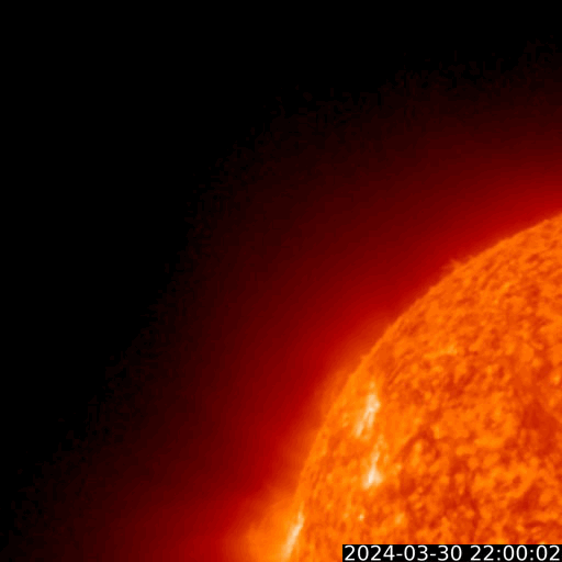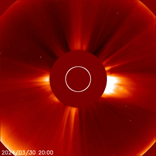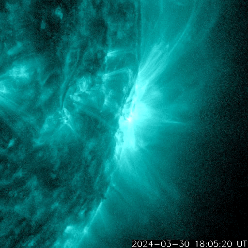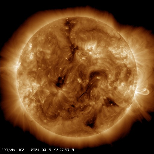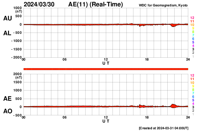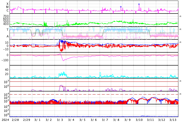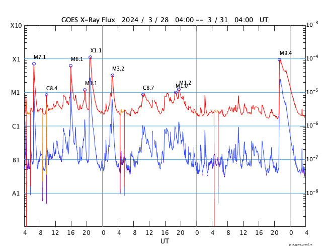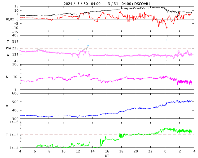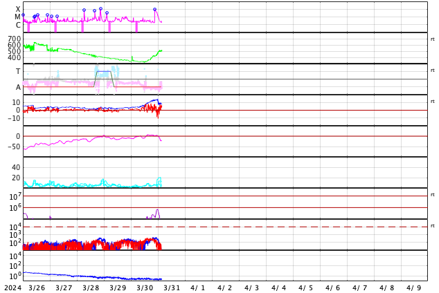 2024/ 3/31 13:01 更新 M9.4の中規模フレアが発生しました。太陽風の速度が高まっています。 担当 篠原 今朝、31日6時(世界時30日21時)に、 太陽の南西の端(右下)に沈みつつある3615黒点群で、 M9.4と、Xクラス寸前の中規模フレアが発生しました。 SDO衛星AIA131の動画を掲載します。 現在の可視光写真では、 3615群は最後の黒点が微かに見える程度です。 この後の活動は、こちらからは見えなくなります。 この直後、31日7時半(世界時30日22時半)には、 北東の端近く(左上)でフィラメント噴出が発生しています。 GOES衛星SUVI 304の動画を掲載します。 SOHO衛星LASCO C2、C3によると、 M9.4フレアにより、 太陽の右側へとても淡いCME(コロナ質量放出)が飛び出し、 フィラメント噴出により、 太陽の左上にCMEが発生しています。 どちらも地球に対して横向きの噴出なので、 影響はないでしょう。 可視光写真を見ると、太陽は黒点が少なくなっています。 太陽はしばらく穏やかになりそうです。 太陽風は、昨日は330km/秒と低速でしたが、 今日に入った頃から速度が高まり始め、 31日10時(世界時31日1時)頃に500km/秒へ達して、 高速の状態に変わっています。 磁場強度は、4nTと平均的な状態だったのが、 昨夕から強まり始め、今朝には13nTに達しました。 その後磁場強度は下がり、現在は8nTとやや強まった程度です。 磁場の南北成分は、概ね北寄りで推移しています。 このため磁気圏は穏やかで、 磁場が一時的に南向きに強まった今朝くらいに、 AE指数で600nTの中規模の変化が発生した程度です。 現在の磁場は北向きに戻っています。 磁気圏の活動も穏やかになるでしょう。 今回の太陽風速度の高まりは、 関係する領域が良く分かりませんでした。 高速風はどの様に推移するでしょうか。