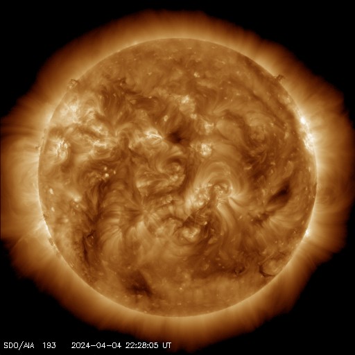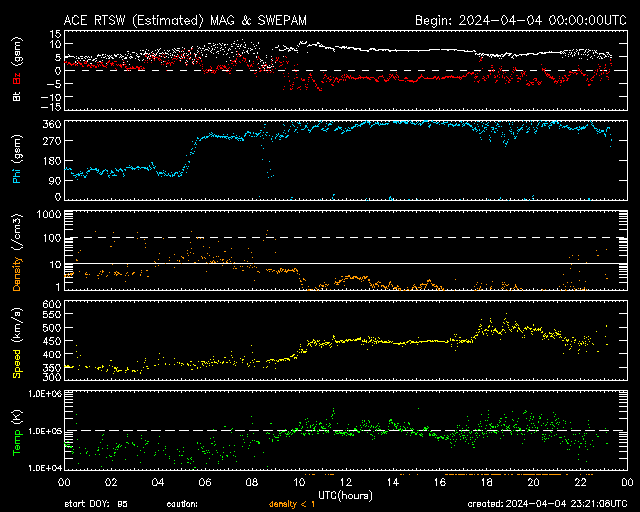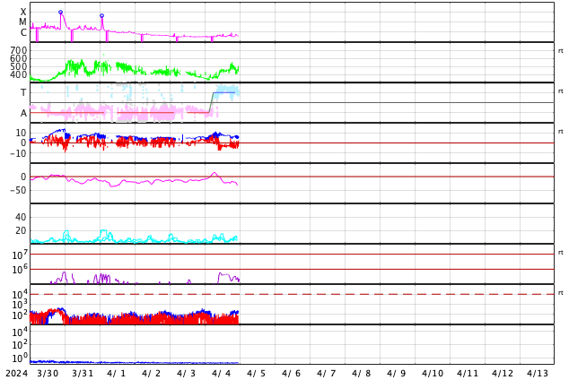 2024/ 4/ 5 08:23 更新 太陽風は平均的な状態です。太陽は穏やかです。 担当 篠原 太陽風は、350km/sと低速の状態でしたが、 昨夕に450km/sへ少し上がり、 平均的な速さに戻っています。 磁場強度は、5nTと8nTの間を上下しています。 こちらも平均的な状態です。 磁場の南北成分は、 速度が高まった頃から 弱い南寄りで推移する様になっています。 このため磁気圏の活動も少し強まり、 AE指数は、500〜800nTの中規模の変化が 続く様になっています。 SDO衛星AIA193では、 コロナホールは特になく、 太陽風は穏やかに推移しそうです。 太陽は、特にフレアの発生はなく、 穏やかな状態が続いています。 一方、SOHO衛星LASCO C2、C3を見ると、 弱いCMEが度々発生しています。 太陽の向こう側では、 ある程度の活動が起きている様です。 これからメキシコ行きの飛行機に乗ります。 以降は可能な範囲で更新したいと思っています。