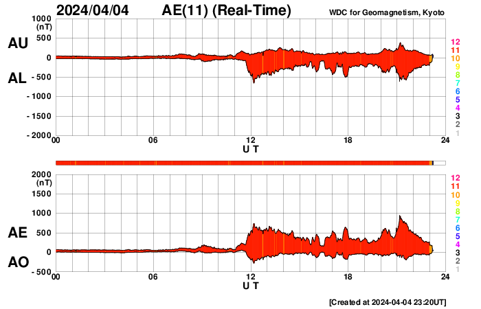 (c) SDO (NASA) ![]() SDO衛星による太陽の可視光写真 (c) SDO (NASA) ![]() ACEが観測した太陽風の磁場(1番上の枠、白線は全体の強度、赤線は南北成分) および、太陽風の密度(3番目の橙線)、速度(4番目の黄線) (c) NOAA/SWPC ![]() AE指数(速報値) 下段のAEグラフの値が高くなると、オーロラ活動が活発化しています。 (c) 京都大学WDC ![]() 27日の太陽周期に合わせた図 太陽が同じ面を地球に向けていた27日前の変化から、今後を予想することができます。 (c) 作図:宇宙天気ニュース