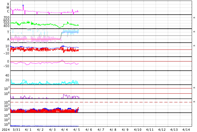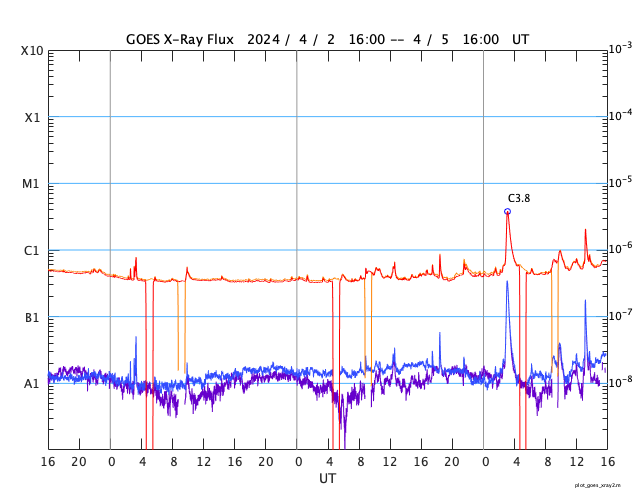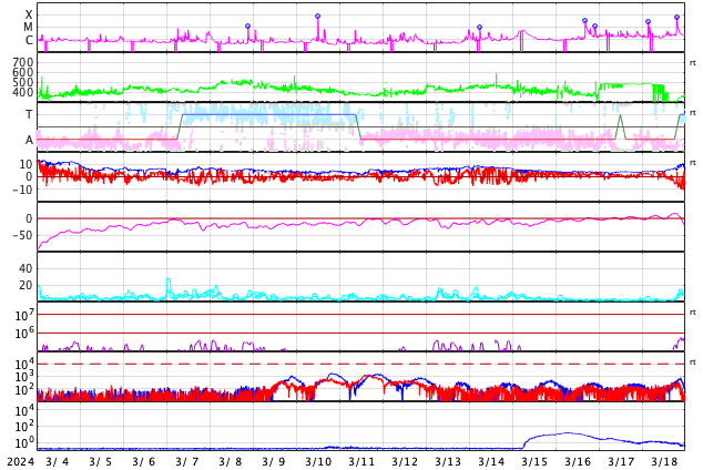 GOES衛星の太陽X線強度。赤・橙 = 0.1〜0.8 nm、青・紫 = 0.05〜0.4 nm (c) データ:NOAA/SWPC、作図:宇宙天気ニュース ![]() | ||||||||||||||||||||||||||||||||||||||||||||||||||||||||||||||||||||||||||||||||||||||||||||||||||||||||||||||||||||||||||||||||||||||||||||||||||||||||||||||||||||||||||||||||||||||||||||||||||||||||||||||||||||||||||||||