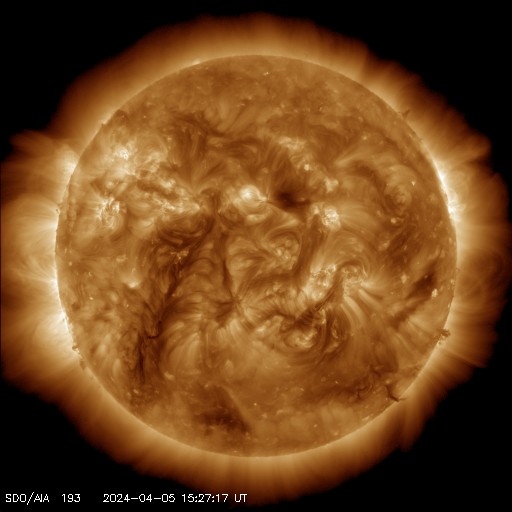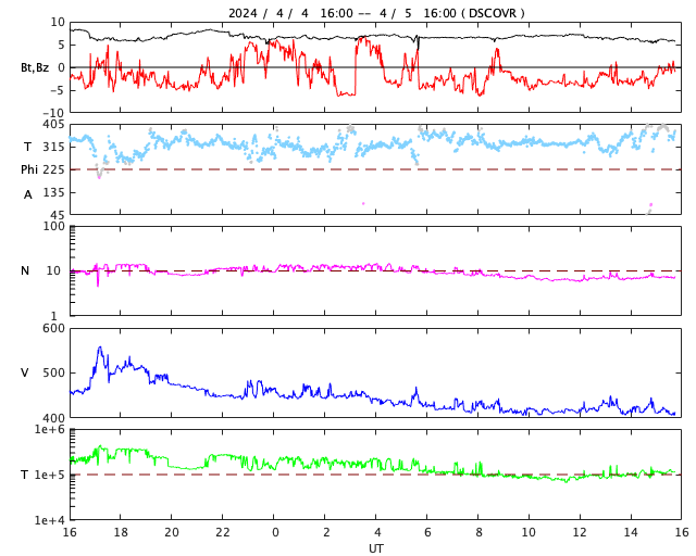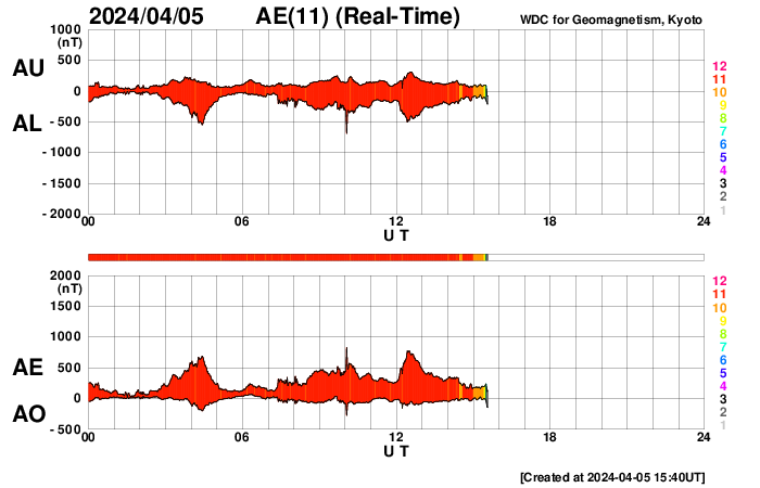 2024/ 4/ 6 00:58 更新 太陽風は平均的な状態です。磁気圏の活動が続いています。 担当 篠原 太陽風は、速度が450km/sから420km/sへ少し下がっています。 平均的な状態が続いています。 磁場強度は、6〜7nTで推移しています。 磁場の南北成分は、南寄りの傾向が続いています。 磁気圏は活動的な状態が続いていて、 AE指数は、500〜800nTの中規模の変化が続いています。 SDO衛星AIA193では、 コロナホールは特に見えていません。 太陽風は穏やかに推移しそうです。 太陽は、東端(左側)の向こう側で、 C3.8の小規模フレアが発生しました。 フレアの全体が見えていないので、 本当の規模はこれよりも大きかった可能性があります。 この後、活動的な領域が現れるかもしれません。 メキシコシティに着きました。 この後、日食が見られる北部の町へ移動します。 以降は、ネットの環境が厳しくなるかもしれません。