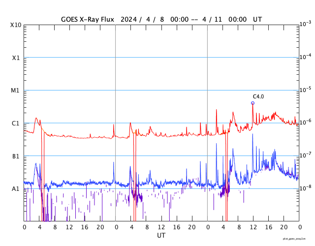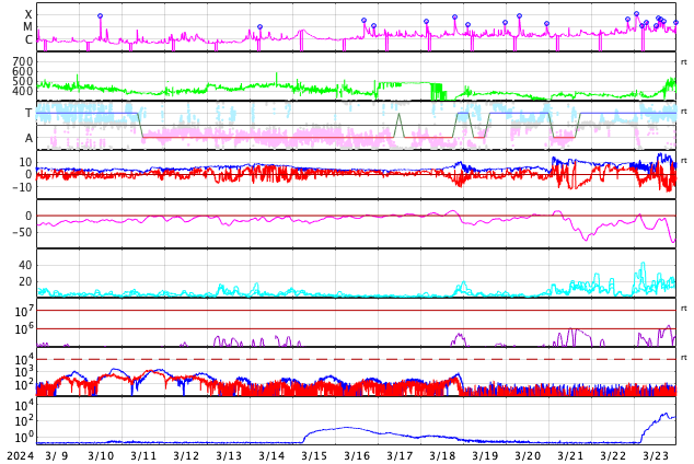 GOES衛星の太陽X線強度。赤・橙 = 0.1〜0.8 nm、青・紫 = 0.05〜0.4 nm (c) データ:NOAA/SWPC、作図:宇宙天気ニュース ![]() | ||||||||||||||||||||||||||||||||||||||||||||||||||||||||||||||||||||||||||||||||||||||||||||||||||||||||||||||||||||||||||||||||||||||||||||||||||||||||||||||||||||||||||||||||||||||||||||||||||||||||||||||||||||||||||||||||||||||||