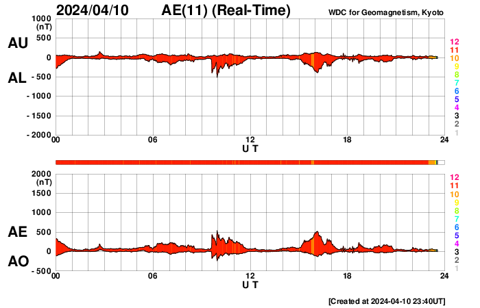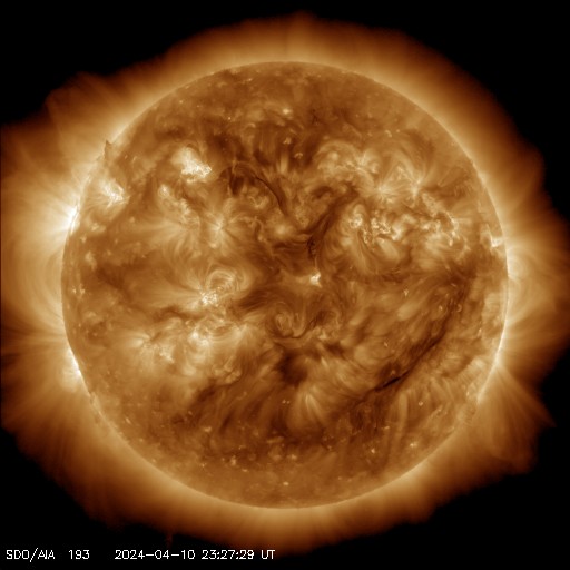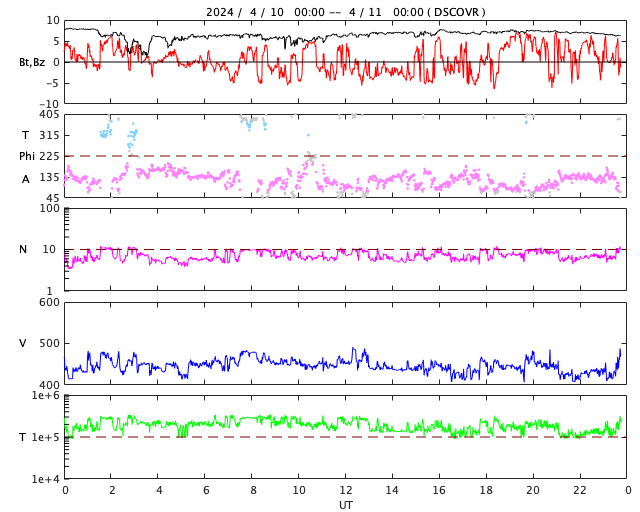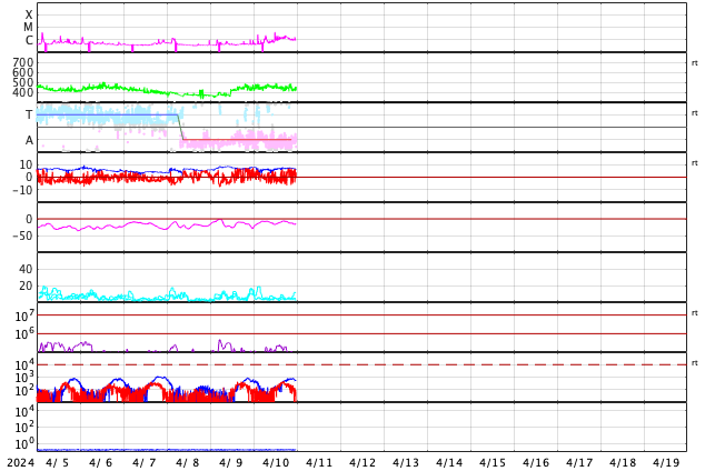 2024/ 4/11 08:54 更新 太陽風は平均的な状態です。Cクラスのフレアが発生しています。 担当 篠原 太陽風の速度は、440km/sで推移しています。 磁場強度は、7nT前後です。 どちらも平均的な状態です。 磁場の南北成分は、南北に細かく変化しています。 南寄りになった時間帯に磁気圏の活動が高まって、 AE指数では、500nTの中規模の変化が 2回発生しています。 SDO衛星AIA193の太陽コロナ写真では、 コロナホールは特に見えていません。 この後も穏やかな太陽風が続きそうです。 太陽では、北西の端(左上)に達した 3629黒点群の活動がやや強まり、 10日20時半(世界時10日11時半)に C4.0の小規模フレアや、 その前後に、C1〜2の小さい小規模フレアを 多数起こしています。 その他の領域は穏やかなので、 この後の太陽は穏やかになりそうです。 メキシコシティに戻って来ました。 この後、日本行きの飛行機に乗り、 金曜日の昼頃に成田に着く予定です。 土曜日から通常の更新に戻れそうです。