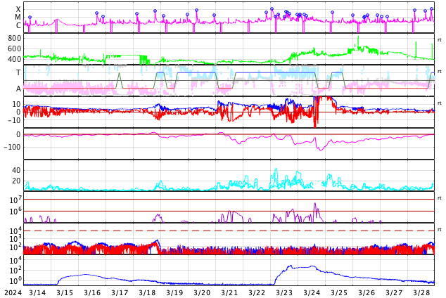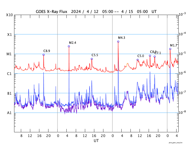 GOES衛星の太陽X線強度。赤・橙 = 0.1〜0.8 nm、青・紫 = 0.05〜0.4 nm (c) データ:NOAA/SWPC、作図:宇宙天気ニュース ![]() | ||||||||||||||||||||||||||||||||||||||||||||||||||||||||||||||||||||||||||||||||||||||||||||||||||||||||||||||||||||||||||||||||||||||||||||||||||||||||||||||||||||||||||||||||||||||||||||||||||||||||||||||||||||||||||||||||||||||||||||||||||||||||||||||||||||||||||||||||||||||||||||||||||||||||||||