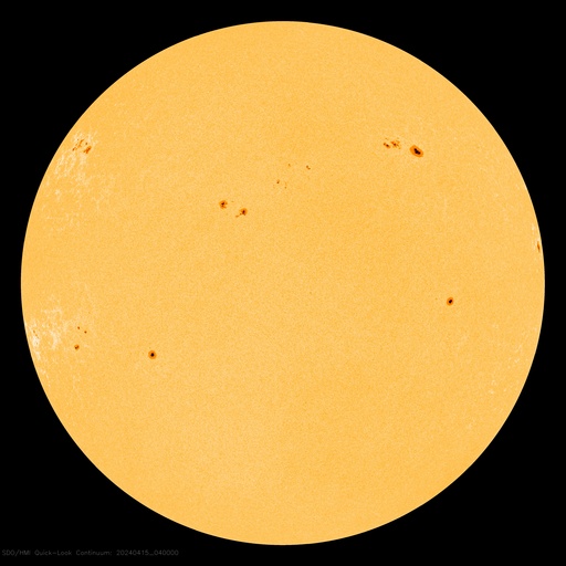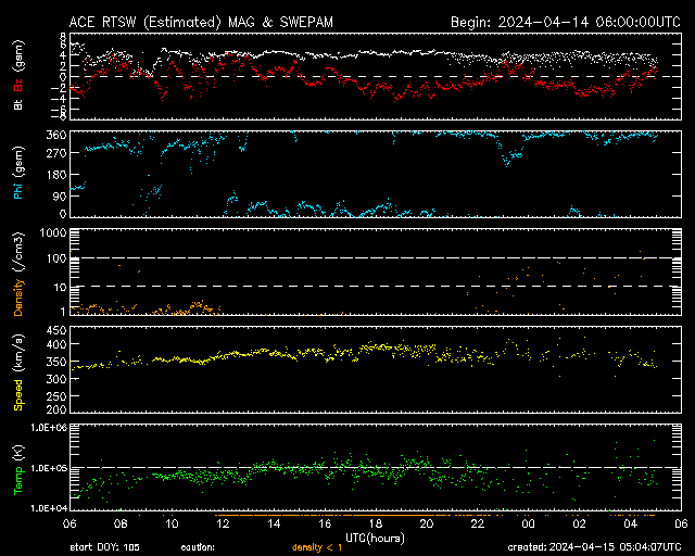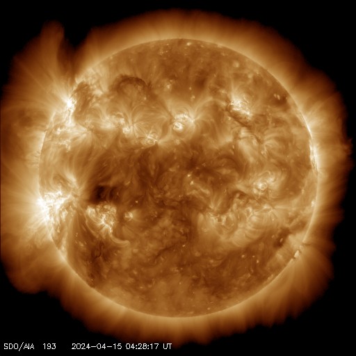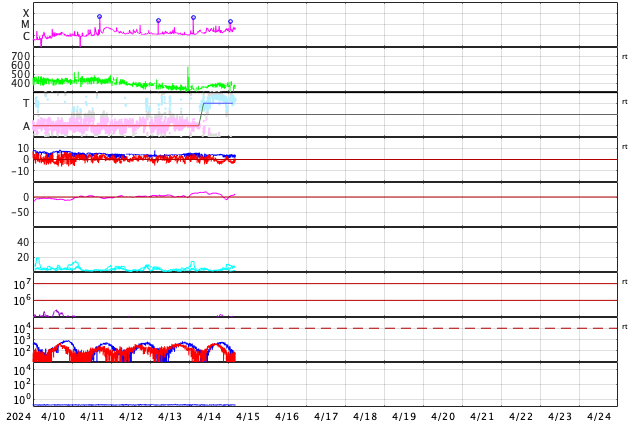 2024/ 4/15 14:06 更新 太陽風は低速で、磁気圏も穏やかです。フレアが増えています。 担当 篠原 太陽風は、370km/秒付近と低速の状態が続いています。 磁場強度は、4nTと平均的な状態です。 磁気圏は穏やかで、 AE指数は小さい変化が見られる程度です。 SDO衛星AIA193の太陽コロナ写真は、 コロナホールは特に見えていません。 CME(コロナ質量放出)による突発性の変化を除くと、 太陽風は穏やかに推移しそうです。 太陽は、北東の端近く(左上)の3639黒点群で、 Cクラスの小規模フレアが頻繁に発生するようになり、 15日10時(世界時15日1時)には、 M1.7の中規模フレアも発生しています。 また、南東側(左下)でも、3636群でC5.0、 端に近い領域でC4.4などの小規模フレアが発生しています。 この後の活動に注目してください。