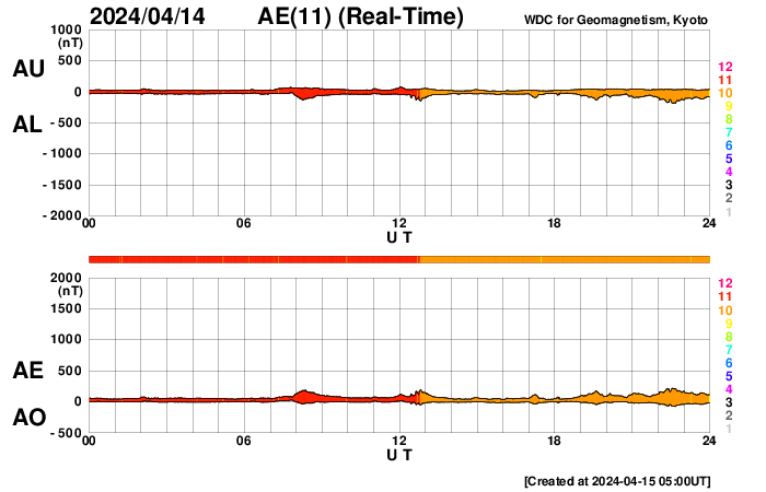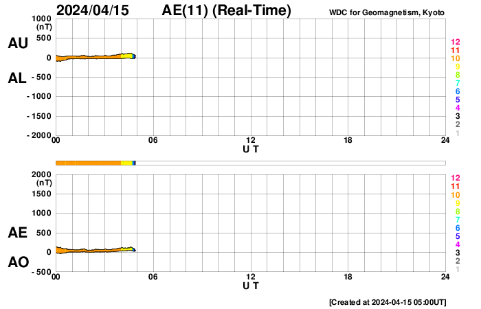 (c) SDO (NASA) ![]() SDO衛星による太陽の可視光写真。マウスの矢印を写真に重ねると、黒点番号付きの写真に切り替わります。 (c) SDO (NASA) ![]() ACEが観測した太陽風の磁場(1番上の枠、白線は全体の強度、赤線は南北成分) および、太陽風の密度(3番目の橙線)、速度(4番目の黄線) (c) NOAA/SWPC ![]() AE指数(速報値) 下段のAEグラフの値が高くなると、オーロラ活動が活発化しています。 (c) 京都大学WDC ![]() ![]() 27日の太陽周期に合わせた図 太陽が同じ面を地球に向けていた27日前の変化から、今後を予想することができます。 (c) 作図:宇宙天気ニュース