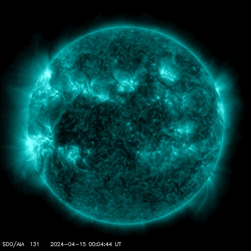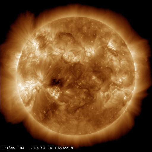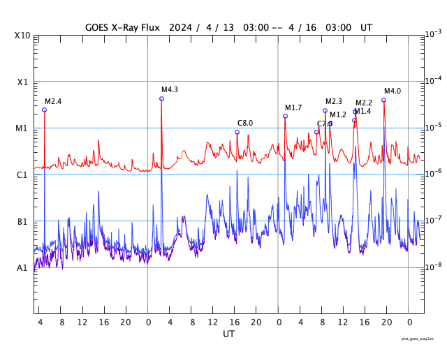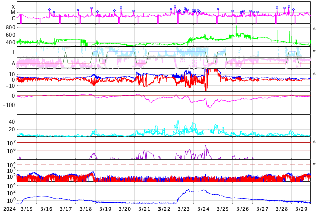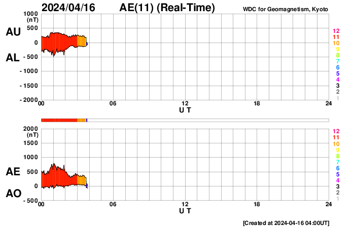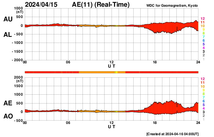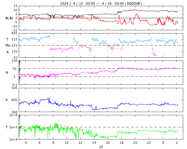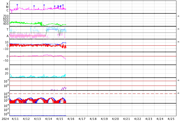2024/ 4/16 13:06 更新 太陽風磁場が南寄りになり、磁気圏の活動がやや強まっています。 担当 篠原 太陽で、Mクラスの中規模フレアの発生が続いています。 北東(左上)の3639黒点群で、 M1.0、M1.2、M1.1、M2.2、M4.0、 北西(右上)の3634群では、 M2.3、M1.4が発生しています。 また、南東(左下)の3637群、3638群でも、 C5.2、C3.9の小規模フレアが発生しています。 引き続き、活動の強まりに注目して下さい。 太陽風は、350km/秒前後の低速の状態が続いていますが、 今日未明、16日2時半(世界時15日17時半)に、 磁場強度が、5nTから8nTへ 小幅ですが急に強まる変化が発生しています。 その頃から、磁場の南北成分が南寄りになり、 -5nTに達する変化が半日近く続いています。 このため、磁気圏の活動もやや強まっていて、 AE指数は600nT程度の中規模の変化が 連続的に発生しています。 太陽風の速度が下がっているため、 磁気圏への影響は限定的になっていますが、 磁場の南寄りの状態はどこまで続くでしょうか。 引き続き注目してください。