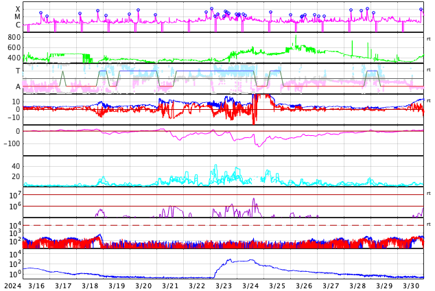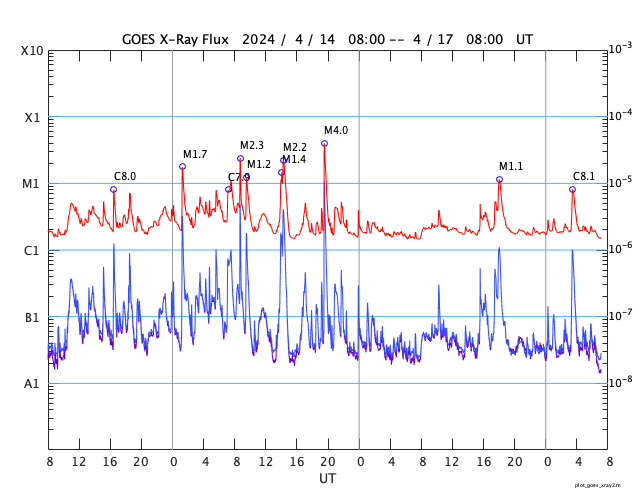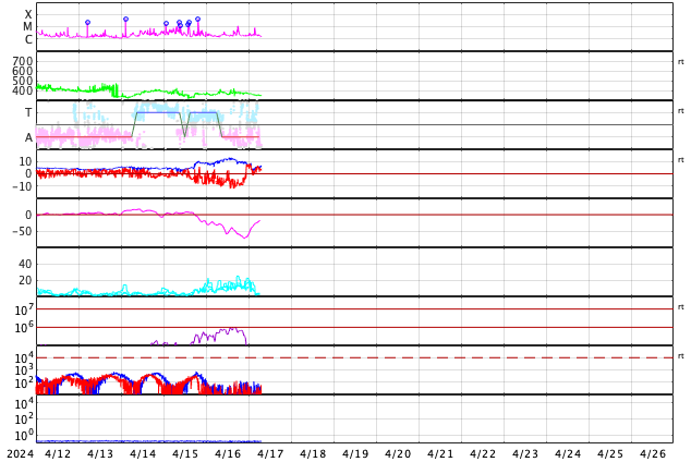 GOES衛星の太陽X線強度。赤・橙 = 0.1〜0.8 nm、青・紫 = 0.05〜0.4 nm (c) データ:NOAA/SWPC、作図:宇宙天気ニュース ![]() | ||||||||||||||||||||||||||||||||||||||||||||||||||||||||||||||||||||||||||||||||||||||||||||||||||||||||||||||||||||||||||||||||||||||||||||||||||||||||||||||||||||||||||||||||||||||||||||||||||||||||||||||||||||||||||||||||||||||||||||||||||||||||||||||||||||||||||||||||||||||||||||||||||||||||||||||||||||||||||||||||||