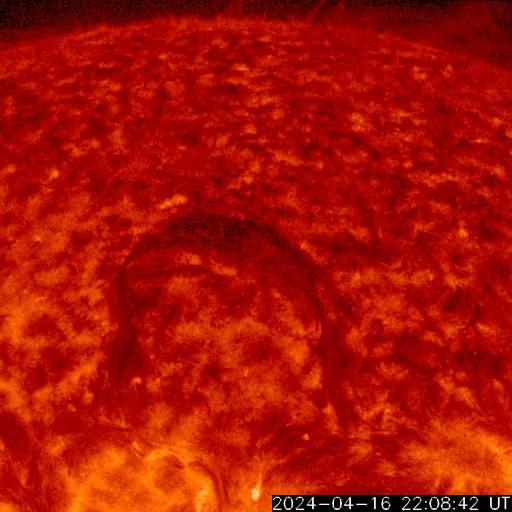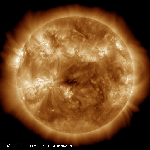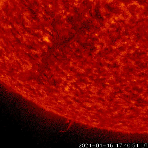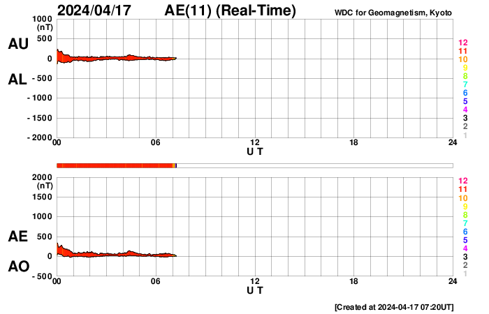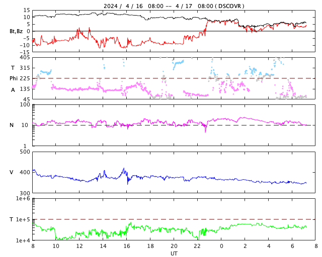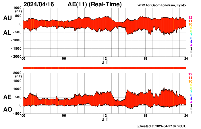 2024/ 4/17 16:24 更新 太陽風磁場の南向きが続き、磁気圏の活動が強まりました。 担当 篠原 太陽風は、今朝まで10nT程度に磁場が強まった状態が続きました。 南北成分も南寄りの傾向が続き、-5〜-10nTで変化しています。 速度は380km/秒とやや低速でしたが、 磁気圏の活動は強まって、 AE指数を見ると、800〜1000nTの中規模の変化が 連続的に発生しています。 その後、磁場の南北成分は北向きに切り替わり、 磁場強度も5nTと平均的な値に下がっています。 このため、磁気圏の活動は穏やかになって、 AE指数は変化が見られなくなっています。 現在、速度は350km/秒へ下がっていて、 低速になっています。 太陽は、今日未明、17日3時(世界時16日18時)に、 南東(左下)の3643黒点群でM1.1の中規模フレア、 今日の昼、17日12時(世界時17日3時)に、 北東(左上)の3639群でC8.1の小規模フレアが発生しましたが、 全体としては、フレアの発生は少なくなっています。 一方、17日4時(世界時16日19時)頃に南側で、 17日10時(世界時17日1時)頃に北側で、 フィラメント噴出が発生しています。 SDO衛星AIA304の動画を掲載します。 前者は下向き、後者は上向きに噴出している様で、 地球へ影響は特にやって来ないかもしれません。