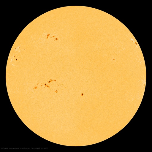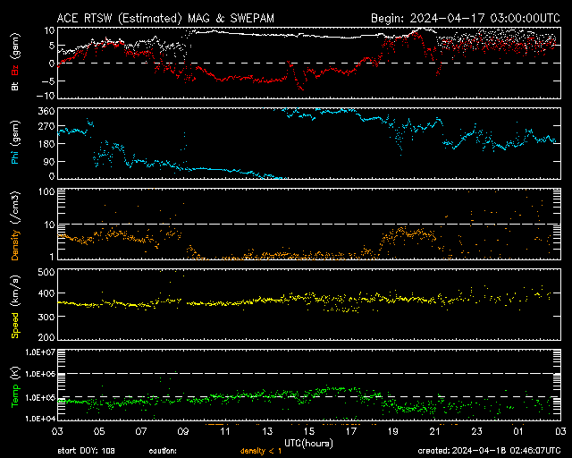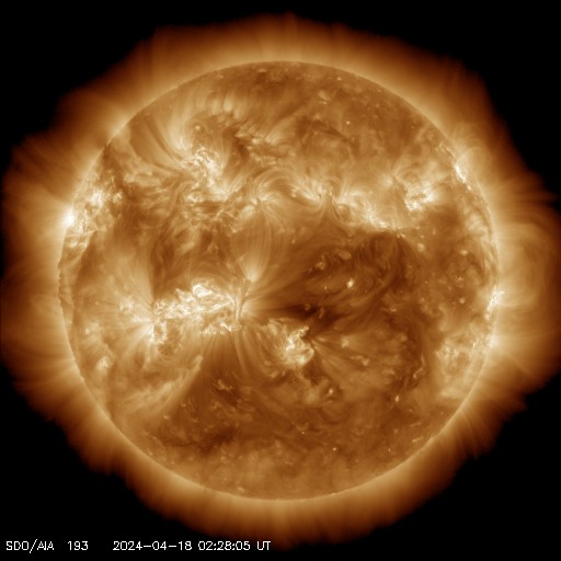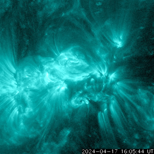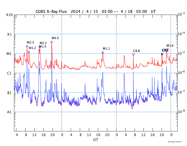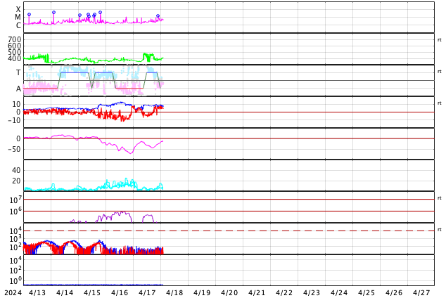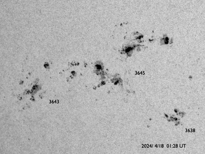 2024/ 4/18 11:48 更新 フレアが増えています。太陽風は平均的な速度です。 担当 篠原 太陽は、南東側(左下)にある 3645、3643、3638黒点群の活動が強まり、 今日に入ってから、 C5.2、C3.3、C4.6、C9.0、C7.8の小規模フレアや、 M1.6の中規模フレアが発生しています。 SDO衛星AIA131の動画と、 SDO衛星による可視光の拡大写真を掲載します。 この後どの様に推移するでしょうか。 注目してください。 太陽風は、速度が350km/秒から400km/秒へ少し上がり、 平均的な速度に戻っています。 磁場強度は、後半で値が乱れて見にくくなっていますが、 8nT前後と少し強まっています。 磁場の南北成分は、 グラフの真ん中に南向きの時間帯があり、 AE指数は、300〜500nTの小規模の変化が発生しています。 その後は、磁場は北向きになっていて、 現在の磁気圏は穏やかです。 ![]() 3645、3643、3638黒点群の活動の様子。 (c) SDO衛星AIA131 (NASA)、(動画加工 : 宇宙天気ニュース) ![]() 3645、3643、3638黒点群の拡大写真。 (c) SDO衛星HMII (NASA)、作図 : 宇宙天気ニュース ![]() SDO衛星のAIA193カメラによる太陽コロナの様子 (c) SDO (NASA) ![]() SDO衛星による太陽の可視光写真。マウスの矢印を写真に重ねると、黒点番号付きの写真に切り替わります。 (c) SDO (NASA) ![]() GOES衛星の太陽X線強度。赤・橙 = 0.1〜0.8 nm、青・紫 = 0.05〜0.4 nm (c) データ:NOAA/SWPC、作図:宇宙天気ニュース ![]() ACEが観測した太陽風の磁場(1番上の枠、白線は全体の強度、赤線は南北成分) および、太陽風の密度(3番目の橙線)、速度(4番目の黄線) (c) NOAA/SWPC ![]() AE指数(速報値) 下段のAEグラフの値が高くなると、オーロラ活動が活発化しています。 (c) 京都大学WDC ![]() ![]() 27日の太陽周期に合わせた図 太陽が同じ面を地球に向けていた27日前の変化から、今後を予想することができます。 (c) 作図:宇宙天気ニュース