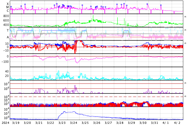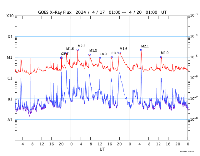 GOES衛星の太陽X線強度。赤・橙 = 0.1〜0.8 nm、青・紫 = 0.05〜0.4 nm (c) データ:NOAA/SWPC、作図:宇宙天気ニュース ![]() | |||||||||||||||||||||||||||||||||||||||||||||||||||||||||||||||||||||||||||||||||||||||||||||||||||||||||||||||||||||||||||||||||||||||||||||||||||||||||||||||||||||||||||||||||||||||||||||||||||||||||||||||||||||||||||||||||||||||||||||||||||||||||||||||||||||||||||||||||||||||||||||||||||||||||||||||||||||||||||||||||||||||||||