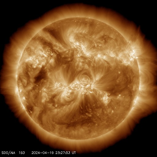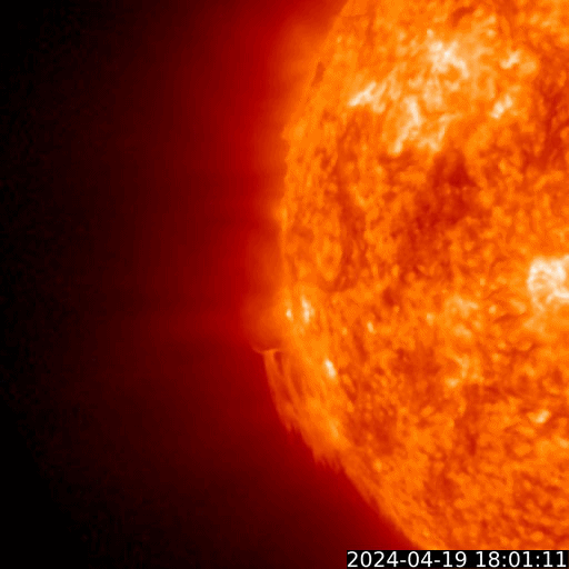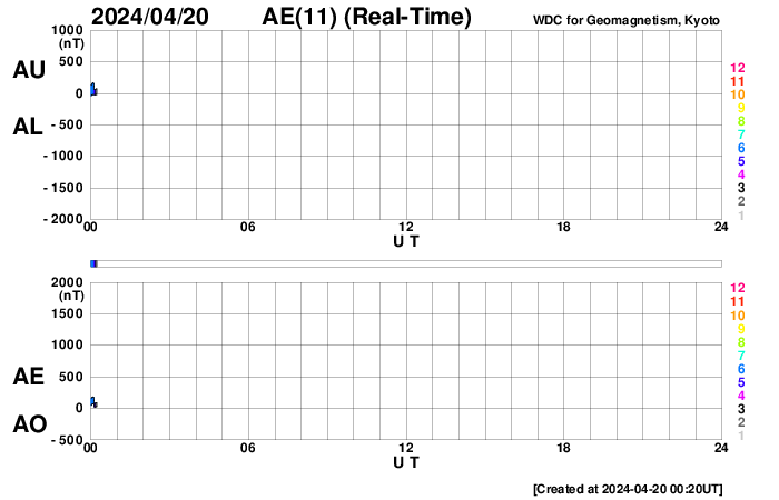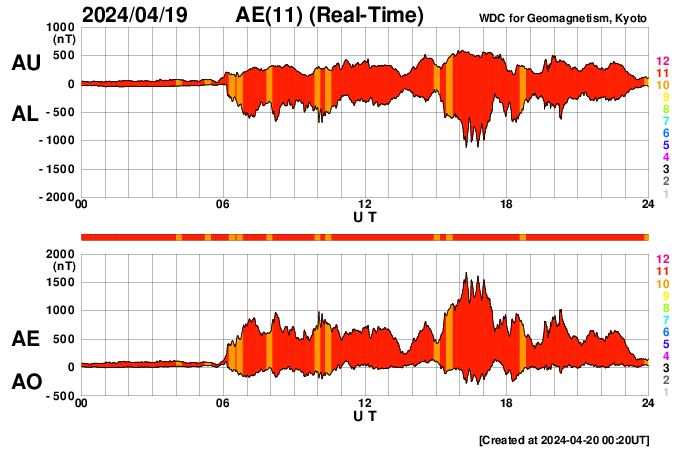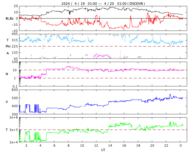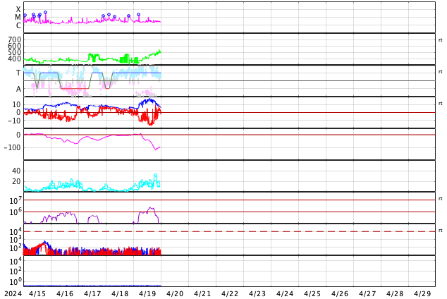 2024/ 4/20 09:37 更新 太陽風磁場の南向きが続き、磁気圏の活動が強まりました。 担当 篠原 昨日のニュースの後、 太陽風の磁場強度は15nT前後まで強まり、 今朝早くまでこの状態が続きました。 磁場の南北成分は南向きに強まり、 -10nT前後、最大で -15nT程度の強まりが 今日未明まで続いています。 350km/秒と低速だった太陽風の速度は、 昨夜から次第に高まり、 現在は500km/秒と高速の状態に達しています。 磁場の南向きの強まりと速度の高まりが重なり、 磁気圏の活動は活発になりました。 AE指数は、500〜1000nTの中規模の変化が17時間ほど続き、 最も高まった時間帯では、 1600nTと大きい変化が発生しています。 現在の太陽風は、速度は500km/秒と高速ですが、 磁場強度は7nTと平均的な状態に下がり、 南北成分は、今朝以降0nT付近で 小さく変化する様になっています。 このため、磁気圏の活動は穏やかになり、 AE指数のグラフの最後は、変化がなくなっています。 この後、速度の高まりはどの様に推移するでしょうか。 太陽は、昨日のニュースの後は活動度が下がり、 中心部南側の領域では、 3647黒点群でM1.0の中規模フレア、 3645群と3638群でC3.5、C4.7の小規模フレアが 発生した程度です。 一方、東端の向こう側(左端)で、 今朝、30日4時(世界時19日19時)にフレアが発生し、 太陽の左に向かってコロナが飛び出しています。 GOES衛星SUVI 304の動画を掲載します。 向こう側に活動的な領域があるのかもしれません。